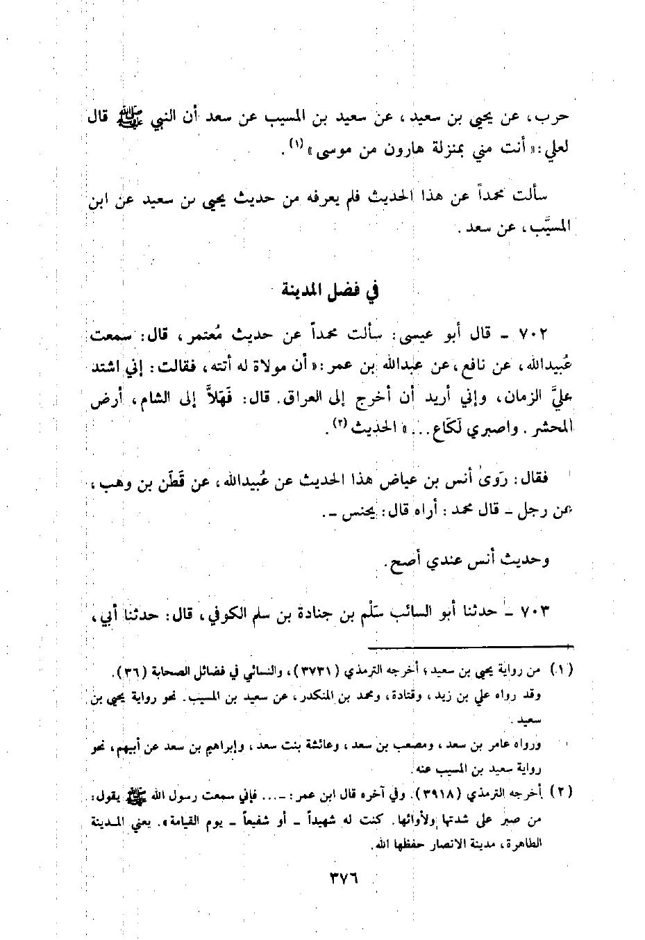 702 - قَالَ أَبُو عِيسَى سَأَلْتُ مُحَمَّدًا عَنْ حَدِيثِ مُعْتَمِرٍ قَالَ: سَمِعْتُ عُبَيْدَ اللَّهِ , عَنْ نَافِعٍ , عَنْ عَبْدِ اللَّهِ بْنِ عُمَرَ , أَنَّ مَوْلَاةَ لَهُ أَتَتْهُ فَقَالَتْ: إِنِّي اشْتَدَّ عَلَيَّ الزَّمَانُ , وَإِنِّي أُرِيدُ أَنْ أَخْرَجَ إِلَى الْعِرَاقِ. قَالَ " فَهَلَّا إِلَى الشَّامِ أَرْضِ الْمَحْشَرِ وَاصْبِرِي لَكَاعُ الْحَدِيثُ فَقَالَ: رَوَى أَنَسُ بْنُ عِيَاضٍ هَذَا الْحَدِيثَ عَنْ عُبَيْدِ اللَّهِ , عَنْ قَطَنِ بْنِ وَهْبٍ , عَنْ رَجُلٍ قَالَ مُحَمَّدٌ: أَرَاهُ قَالَ: يُحَنَّسُ. وَحَدِيثُ أَنَسٍ عِنْدِي أَصَحُّ