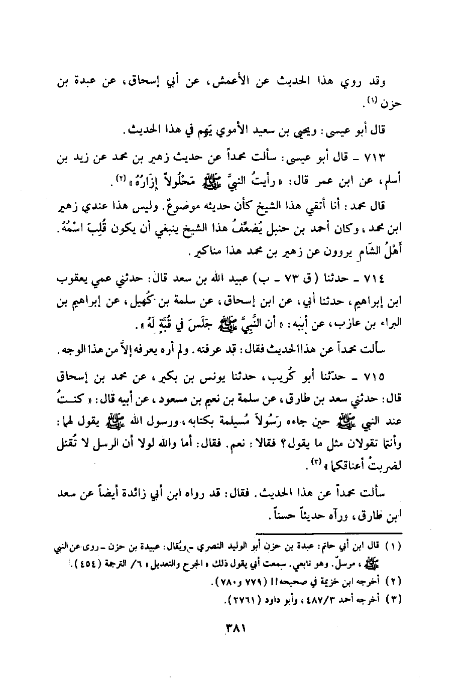 715 - حَدَّثَنَا أَبُو كُرَيْبٍ , حَدَّثَنَا يُونُسُ بْنُ بُكَيْرٍ , عَنْ مُحَمَّدِ بْنِ إِسْحَاقَ , قَالَ: حَدَّثَنِي سَعْدُ بْنُ طَارِقٍ , عَنْ سَلَمَةَ بْنِ نُعَيْمِ بْنِ مَسْعُودٍ , عَنْ أَبِيهِ , قَالَ: كُنْتُ عِنْدَ النَّبِيِّ صَلَّى اللهُ عَلَيْهِ وَسَلَّمَ حِينَ جَاءَهُ رَسُولَا مُسَيْلِمَةَ بِكِتَابِهِ , وَرَسُولُ اللَّهِ صَلَّى اللهُ عَلَيْهِ وَسَلَّمَ يَقُولُ لَهُمَا: " وَأَنْتُمَا تَقُولَانِ مِثْلَ مَا يَقُولُ؟ فَقَالَا: نَعَمْ , فَقَالَ: «§أَمَا وَاللَّهِ لَوْلَا أَنَّ الرُّسُلَ لَا تُقْتَلُ لَضَرَبْتُ أَعْنَاقَكُمَا» سَأَلْتُ مُحَمَّدًا عَنْ هَذَا الْحَدِيثِ فَقَالَ: قَدْ رَوَاهُ ابْنُ أَبِي زَائِدَةَ أَيْضًا عَنْ سَعْدِ بْنِ طَارِقٍ , وَرَآهُ حَدِيثًا حَسَنًا