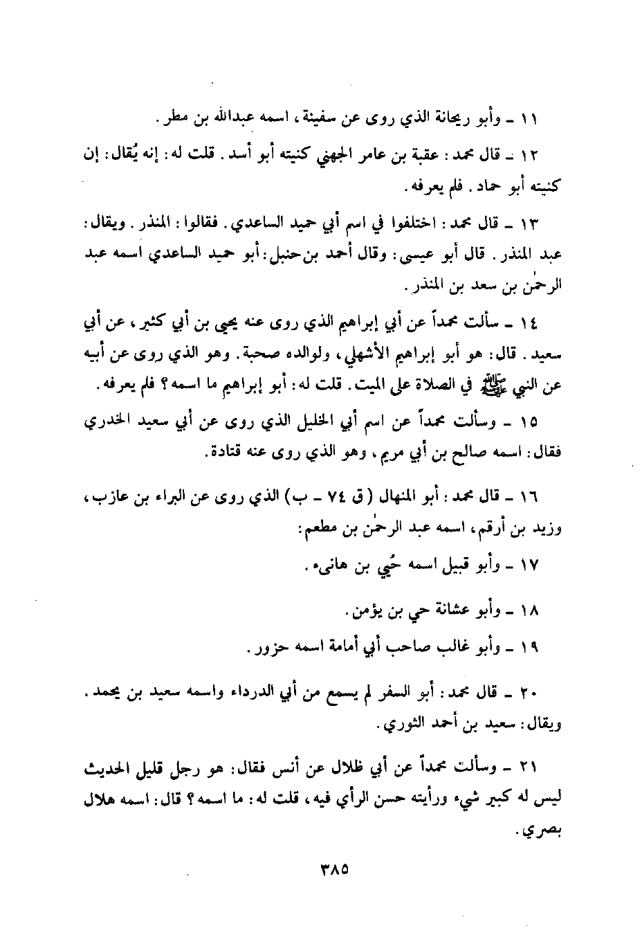 وَأَبُو رَيْحَانَةَ الَّذِي رَوَى عَنْ سَفِينَةَ , اسْمُهُ عَبْدُ اللَّهِ بْنُ مَطَرٍ. قَالَ مُحَمَّدٌ: عُقْبَةُ بْنُ عَامِرٍ الْجُهَنِيُّ كُنْيَتُهُ أَبُو أَسَدٍ قُلْتُ لَهُ: إِنَّهُ يُقَالُ: إِنَّ كُنْيَتَهُ أَبُو حَمَّادٍ فَلَمْ يَعْرِفْهُ. قَالَ مُحَمَّدٌ: اخْتَلَفُوا فِي اسْمِ أَبِي حُمَيْدٍ السَّاعِدِيِّ فَقَالُوا: الْمُنْذِرُ. وَيُقَالُ: عَبْدُ الْمُنْذِرِ. قَالَ أَبُو عِيسَى: وَقَالَ أَحْمَدُ بْنُ حَنْبَلٍ: أَبُو حُمَيْدٍ السَّاعِدِيُّ اسْمُهُ عَبْدُ الرَّحْمَنِ بْنُ سَعْدِ بْنِ الْمُنْذِرِ. سَأَلْتُ مُحَمَّدًا عَنْ أَبِي إِبْرَاهِيمَ الَّذِي , رَوَى عَنْهُ , يَحْيَى بْنُ أَبِي كَثِيرٍ , عَنْ أَبِي سَعِيدٍ , قَالَ: هُوَ أَبُو إِبْرَاهِيمَ الْأَشْهَلِيُّ , وَلِوَالِدِهِ صُحْبَةٌ , وَهُوَ الَّذِي رَوَى عَنْ أَبِيهِ , عَنِ النَّبِيِّ صَلَّى اللهُ عَلَيْهِ وَسَلَّمَ فِي الصَّلَاةِ عَلَى الْمَيِّتِ. قُلْتُ لَهُ: أَبُو إِبْرَاهِيمَ مَا اسْمُهُ؟ فَلَمْ يَعْرِفْهُ. وَسَأَلْتُ مُحَمَّدًا عَنِ اسْمِ أَبِي الْخَلِيلِ الَّذِي , رَوَى عَنْ أَبِي سَعِيدٍ الْخُدْرِيِّ , فَقَالَ: اسْمُهُ صَالِحُ بْنُ أَبِي مَرْيَمَ , وَهُوَ الَّذِي رَوَى عَنْهُ , قَتَادَةُ. قَالَ مُحَمَّدٌ: أَبُو الْمِنْهَالِ الَّذِي رَوَى عَنِ الْبَرَاءِ بْنِ عَازِبٍ , وَزَيْدُ بْنُ أَرْقَمَ , اسْمُهُ عَبْدُ الرَّحْمَنِ بْنُ مُطْعِمٍ. وَأَبُو قَبِيلٍ اسْمُهُ حُيَيُّ بْنُ هَانِئٍ. وَأَبُو عُشَّانَةَ حُيَيُّ بْنُ يُؤْمِنَ. وَأَبُو غَالِبٍ صَاحِبُ أَبِي أُمَامَةَ اسْمُهُ حَزَوَّرٌ. قَالَ مُحَمَّدٌ: أَبُو السَّفَرِ لَمْ يَسْمَعْ مِنْ أَبِي الدَّرْدَاءِ وَاسْمُهُ سَعِيدُ بْنُ يَحْمَدَ , وَيُقَالُ سَعِيدُ بْنُ أَحْمَدَ الثَّوْرِيُّ. وَسَأَلْتُ مُحَمَّدًا عَنْ أَبِي ظِلَالٍ , عَنْ أَنَسٍ , فَقَالَ: هُوَ رَجُلٌ قَلِيلُ الْحَدِيثِ لَيْسَ لَهُ كَبِيرُ شَيْءٍ وَرَأَيْتُهُ حَسَنَ الرَّأْيِ فِيهِ. قُلْتُ لَهُ: مَا اسْمُهُ؟ قَالَ: اسْمُهُ هِلَالٌ بَصْرِيُّ