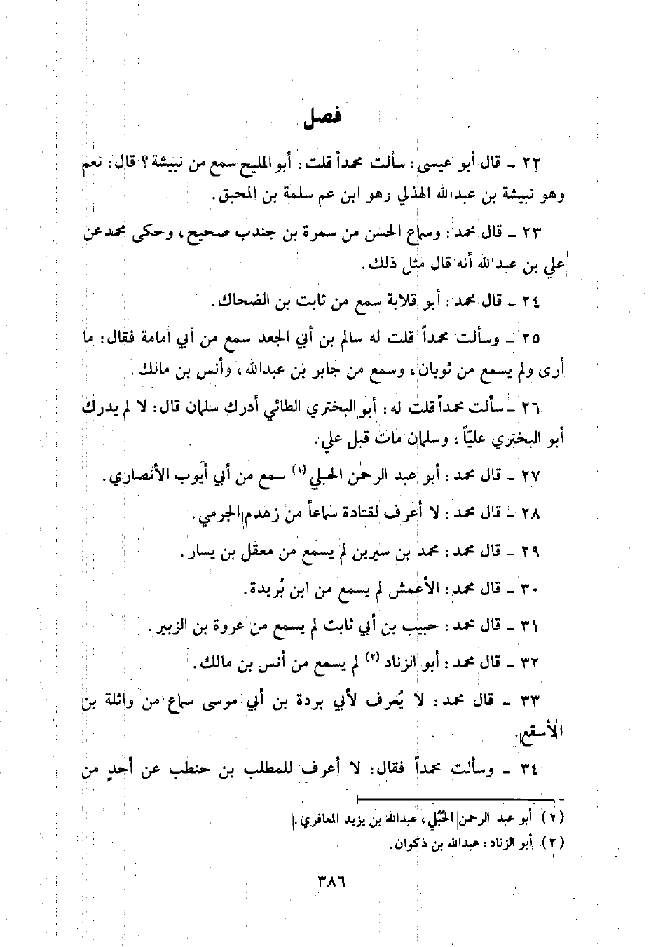 §فَصْلٌ قَالَ أَبُو عِيسَى: سَأَلْتُ مُحَمَّدًا قُلْتُ: أَبُو الْمَلِيحِ سَمِعَ مِنَ نُبَيْشَةَ؟ قَالَ: نَعَمْ , وَهُوَ نُبَيْشَةُ بْنُ عَبْدِ اللَّهِ الْهُذَلِيُّ وَهُوَ ابْنُ عَمِّ سَلَمَةَ بْنِ الْمُحَبِّقِ. قَالَ مُحَمَّدٌ: وَسَمَاعُ الْحَسَنِ مِنْ سَمُرَةَ بْنِ جُنْدُبٍ صَحِيحٌ. وَحَكَى مُحَمَّدٌ عَنْ عَلِيِّ بْنِ عَبْدِ اللَّهِ أَنَّهُ قَالَ مِثْلَ ذَلِكَ. قَالَ مُحَمَّدٌ: أَبُو قِلَابَةَ سَمِعَ مِنْ , ثَابِتِ بْنِ الضَّحَّاكِ. وَسَأَلْتُ مُحَمَّدًا قُلْتُ لَهُ: سَالِمُ بْنُ أَبِي الْجَعْدِ سَمِعَ مِنَ أَبِي أُمَامَةَ؟ فَقَالَ: مَا أَرَى وَلَمْ يَسْمَعْ مِنْ ثَوْبَانَ , وَسَمِعَ مِنَ جَابِرِ بْنِ عَبْدِ اللَّهِ وَأَنَسِ بْنِ مَالِكٍ. سَأَلْتُ مُحَمَّدًا قُلْتُ لَهُ: أَبُو الْبَخْتَرِيِّ الطَّائِيُّ أَدْرَكَ سَلْمَانَ؟ قَالَ: لَا , لَمُ يُدْرِكْ أَبُو الْبَخْتَرِيِّ عَلِيًّا , وَسَلْمَانُ مَاتَ قَبْلَ عَلِيٍّ. قَالَ مُحَمَّدٌ: أَبُو عَبْدِ الرَّحْمَنِ الْحُبُلِيُّ سَمِعَ مِنَ أَبِي أَيُّوبَ الْأَنْصَارِيِّ. قَالَ مُحَمَّدٌ: لَا أَعْرِفُ لِقَتَادَةَ سَمَاعًا مِنْ زَهْدَمٍ الْجَرْمِيِّ. قَالَ مُحَمَّدٌ: مُحَمَّدُ بْنُ سِيرِينَ لَمْ يَسْمَعْ مِنْ مَعْقِلِ بْنِ يَسَارٍ. قَالَ مُحَمَّدٌ: الْأَعْمَشُ لَمْ يَسْمَعْ مِنِ ابْنِ بُرَيْدَةَ. قَالَ مُحَمَّدٌ: حَبِيبُ بْنُ أَبِي ثَابِتٍ لَمْ يَسْمَعْ مِنْ عُرْوَةَ بْنِ الزُّبَيْرِ. قَالَ مُحَمَّدٌ: أَبُو الزِّنَادِ لَمْ يَسْمَعْ مِنْ أَنَسِ بْنِ مَالِكٍ. قَالَ مُحَمَّدٌ: لَا يُعْرَفُ لِأَبِي بُرْدَةَ بْنِ أَبِي مُوسَى سَمَاعٌ مِنْ وَاثِلَةَ بْنِ الْأَسْقَعِ. وَسَأَلْتُ مُحَمَّدًا فَقَالَ: لَا أَعْرِفُ لِلْمُطَّلِبِ بْنِ حَنْطَبٍ , عَنْ أَحَدٍ مِنْ أَصْحَابِ النَّبِيِّ صَلَّى اللهُ عَلَيْهِ وَسَلَّمَ سَمَاعًا إِلَّا أَنَّهُ يَقُولُ: حَدَّثَنِي مَنْ شَهِدَ النَّبِيَّ صَلَّى اللهُ عَلَيْهِ وَسَلَّمَ. وَسَمِعْتُ عَبْدَ اللَّهِ بْنَ عَبْدِ الرَّحْمَنِ يَقُولُ مِثْلَهُ قَالَ: عَبْدُ اللَّهِ , وَأَنْكَرَ عَلِيُّ بْنُ الْمَدِينِيِّ أَنْ يَكُونَ الْمُطَّلِبُ بْنُ حَنْطَبٍ سَمِعَ مِنَ أَنَسِ بْنِ مَالِكٍ
