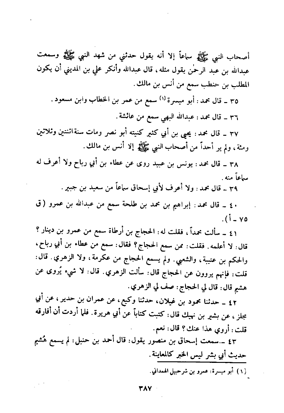قَالَ مُحَمَّدٌ: أَبُو مَيْسَرَةَ سَمِعَ مِنْ عُمَرَ بْنِ الْخَطَّابِ وَابْنِ مَسْعُودٍ. قَالَ مُحَمَّدٌ: عَبْدُ اللَّهِ الْبَهِيُّ سَمِعَ مِنَ عَائِشَةَ. قَالَ مُحَمَّدٌ: يَحْيَى بْنُ أَبِي كَثِيرٍ كُنْيَتُهُ أَبُو نَصْرٍ , وَمَاتَ سَنَةَ اثْنَتَيْنِ وَثَلَاثِينَ وَمِئَةٍ وَلَمْ يَرَ أَحَدًا مِنْ أَصْحَابِ النَّبِيِّ صَلَّى اللهُ عَلَيْهِ وَسَلَّمَ إِلَّا أَنَسَ بْنَ مَالِكٍ. قَالَ مُحَمَّدٌ: يُونُسُ بْنُ عُبَيْدٍ رَوَى عَنْ عَطَاءِ بْنِ أَبِي رَبَاحٍ , وَلَا أَعْرِفُ لَهُ سَمَاعًا مِنْهُ. قَالَ مُحَمَّدٌ: وَلَا أَعْرِفُ لِأَبِي إِسْحَاقَ سَمَاعًا مِنْ سَعِيدِ بْنِ جُبَيْرٍ. قَالَ مُحَمَّدٌ: إِبْرَاهِيمُ بْنُ مُحَمَّدِ بْنِ طَلْحَةَ سَمِعَ مِنَ عَبْدِ اللَّهِ بْنِ عَمْرٍو. سَأَلْتُ مُحَمَّدًا فَقُلْتُ لَهُ: الْحَجَّاجُ بْنُ أَرْطَاةَ سَمِعَ مِنْ عَمْرِو بْنِ دِينَارٍ. قَالَ: لَا أَعْلَمُهُ , فَقُلْتُ: مِمَّنْ سَمِعَ الْحَجَّاجُ؟ فَقَالَ: سَمِعَ مِنْ عَطَاءِ بْنِ أَبِي رَبَاحٍ , وَالْحَكَمِ بْنِ عُتَيْبَةَ وَالشَّعْبِيِّ , وَلَمْ يَسْمَعِ الْحَجَّاجُ مِنْ عِكْرِمَةَ وَلَا الزُّهْرِيِّ. قَالَ: قُلْتُ: فَإِنَّهُمْ يَرْووُنَ عَنِ الْحَجَّاجِ , قَالَ: سَأَلْتُ الزُّهْرِيَّ قَالَ: لَا شَيْءَ يُرْوَى عَنْ هُشَيْمٍ قَالَ: قَالَ لِي الْحَجَّاجُ: صِفْ لِيَ الزُّهْرِيَّ. حَدَّثَنَا مَحْمُودُ بْنُ غَيْلَانَ , حَدَّثَنَا وَكِيعٌ , عَنْ عِمْرَانَ بْنِ حُدَيْرٍ , عَنْ أَبِي مِجْلَزٍ , عَنْ بَشِيرِ بْنِ نَهِيكٍ , قَالَ: كُتِبَتْ كِتَابًا عَنْ أَبِي هُرَيْرَةَ , فَلَمَّا أَرَدْتُ أَنْ أُفَارِقَهُ , قُلْتُ: أَرْوِي هَذَا عَنْكَ؟ قَالَ: نَعَمْ. سَمِعْتُ إِسْحَاقَ بْنِ مَنْصُورٍ , يَقُولُ: قَالَ أَحْمَدُ بْنُ حَنْبَلٍ: لَمْ يَسْمَعْ هُشَيْمٌ حَدِيثَ أَبِي بِشْرٍ , لَيْسَ الْخَبَرُ كَالْمُعَايَنَةِ