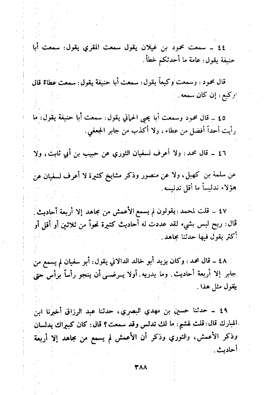 سَمِعْتُ مَحْمُودَ بْنَ غَيْلَانَ , يَقُولُ: سَمِعْتُ الْمُقْرِيَّ , يَقُولُ: سَمِعْتُ أَبَا حَنِيفَةَ , يَقُولُ: عَامَّةُ مَا أُحَدِّثُكُمْ خَطَأٌ. قَالَ مَحْمُودٌ: وَسَمِعْتُ وَكِيعًا يَقُولُ: سَمِعْتُ أَبَا حَنِيفَةَ يَقُولُ: سَمِعْتُ عَطَاءً قَالَ: وَكِيعٌ إِنْ كَانَ سَمِعَهُ. قَالَ مَحْمُودٌ: وَسَمِعْتُ أَبَا يَحْيَى الْحِمَّانِيَّ , يَقُولُ سَمِعْتُ أَبَا حَنِيفَةَ , يَقُولُ مَا رَأَيْتُ أَحَدًا أَفْضَلَ مِنْ عَطَاءٍ , وَلَا أَكْذَبَ مِنْ جَابِرٍ الْجُعْفِيِّ. قَالَ مُحَمَّدٌ: وَلَا أَعْرِفُ لِسُفْيَانَ الثَّوْرِيِّ عَنْ حَبِيبِ بْنِ أَبِي ثَابِتٍ , وَلَا عَنْ سَلَمَةَ بْنِ كُهَيْلٍ , وَلَا عَنْ مَنْصُورٍ. وَذَكَرَ مَشَايِخَ كَثِيرَةً لَا أَعْرِفُ لِسُفْيَانَ هَؤُلَاءِ تَدْلِيسًا مَا أَقَلَّ تَدْلِيسَهُ. قُلْتُ لِمُحَمَّدٍ: يَقُولُونَ: لَمْ يَسْمَعِ الْأَعْمَشُ مِنْ مُجَاهِدٍ إِلَّا أَرْبَعَةَ أَحَادِيثَ , قَالَ: رِيحٌ لَيْسَ بِشَيْءٍ لَقَدْ عَدَدْتُ لَهُ أَحَادِيثَ كَثِيرَةً نَحْوًا مِنْ ثَلَاثِينَ أَوْ أَقَلَّ أَوْ أَكْثَرَ يَقُولُ فِيهَا: حَدَّثَنَا مُجَاهِدٌ. قَالَ مُحَمَّدٌ: وَكَانَ يَزِيدُ أَبُو خَالِدٍ الدَّالَانِيُّ يَقُولُ: أَبُو سُفْيَانَ لَمْ يَسْمَعْ مِنْ جَابِرٍ إِلَّا أَرْبَعَةَ أَحَادِيثَ , وَمَا يُدْرِيهِ أَوَّلَا يَرْضَى أَنْ يَنْجُوَ رَأْسًا بِرَأْسٍ حَتَّى يَقُولَ مِثْلَ هَذَا. حَدَّثَنَا حُسَيْنُ بْنُ مَهْدِيٍّ الْبَصْرِيُّ , حَدَّثَنَا عَبْدُ الرَّزَّاقِ , أَخْبَرَنَا ابْنُ الْمُبَارَكِ , قَالَ: قُلْتُ لِهُشَيْمٍ: مَا لَكَ تُدَلِّسُ وَقَدْ سَمِعْتَ؟ قَالَ: كَانَ كَبِيرَاكَ يُدَلِّسَانِ. وَذَكَرَ الْأَعْمَشَ وَالثَّوْرِيَّ. وَذَكَرَ أَنَّ الْأَعْمَشَ لَمْ يَسْمَعْ مِنْ مُجَاهِدٍ إِلَّا أَرْبَعَةَ أَحَادِيثَ.