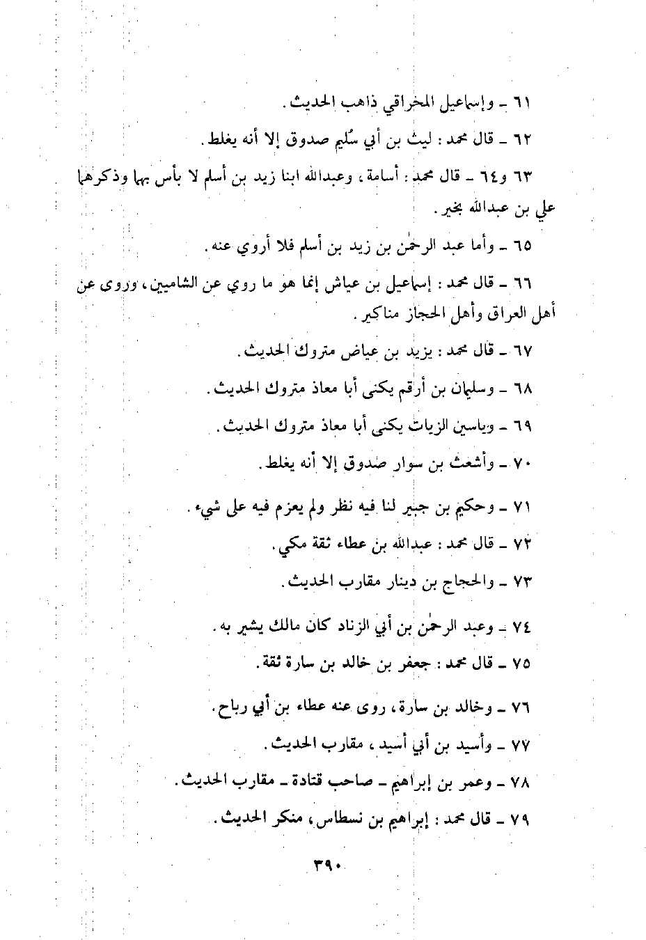 وَإِسْمَاعِيلُ الْمِخْرَاقِيُّ ذَاهِبُ الْحَدِيثِ. قَالَ مُحَمَّدٌ: لَيْثُ بْنُ أَبِي سُلَيْمٍ صَدُوقٌ إِلَّا أَنَّهُ يَغَلَطُ. وَقَالَ مُحَمَّدٌ: أُسَامَةُ وَعَبْدُ اللَّهِ ابْنَا زَيْدِ بْنِ أَسْلَمَ لَا بَأْسَ بِهِمَا , وَذَكَرَهُمَا عَلِيُّ بْنُ عَبْدِ اللَّهِ بِخَيْرٍ. وَأَمَّا عَبْدُ الرَّحْمَنِ بْنُ زَيْدِ بْنِ أَسْلَمَ فَلَا أَرْوِي عَنْهُ. قَالَ مُحَمَّدٌ: إِسْمَاعِيلُ بْنُ عَيَّاشٍ إِنَّمَا هُوَ مَا رُوِيَ عَنِ الشَّامِيِّينَ , وَرَوَى عَنْ أَهْلِ الْعِرَاقِ , وَأَهْلِ الْحِجَازِ مَنَاكِيرَ. قَالَ مُحَمَّدٌ: يَزِيدُ بْنُ عِيَاضٍ مَتْرُوكُ الْحَدِيثِ. وَسُلَيْمَانُ بْنُ أَرْقَمَ يُكْنَى أَبَا مُعَاذٍ مَتْرُوكُ الْحَدِيثِ. وَيَاسِينُ الزَّيَّاتُ يُكْنَى: أَبَا مُعَاذٍ مَتْرُوكُ الْحَدِيثِ. وَأَشْعَثُ بْنُ سَوَّارٍ صَدُوقٌ إِلَّا أَنَّهُ يَغَلَطُ. وَحَكِيمُ بْنُ جُبَيْرٍ لَنَا فِيهِ نَظَرٌ وَلَمْ يُعْزَمْ فِيهِ عَلَى شَيْءٍ. قَالَ مُحَمَّدٌ: عَبْدُ اللَّهِ بْنُ عَطَاءٍ ثِقَةٌ مَكِّيُّ. وَالْحَجَّاجُ بْنُ دِينَارٍ مُقَارِبُ الْحَدِيثِ. وَعَبْدُ الرَّحْمَنِ بْنُ أَبِي الزِّنَادِ كَانَ مَالِكٌ يُشِيرُ بِهِ. قَالَ مُحَمَّدٌ: جَعْفَرُ بْنُ خَالِدِ بْنِ سَارَةَ ثِقَةٌ. وَخَالِدُ بْنُ سَارَةَ رَوَى عَنْهُ , عَطَاءُ بْنُ أَبِي رَبَاحٍ. وَأُسَيْدُ بْنُ أَبِي أُسَيْدٍ مُقَارِبُ الْحَدِيثِ. وَعُمَرُ بْنُ إِبْرَاهِيمَ صَاحِبُ قَتَادَةَ مُقَارِبُ الْحَدِيثِ. قَالَ مُحَمَّدٌ: إِبْرَاهِيمُ بْنُ نِسْطَاسٍ مُنْكَرُ الْحَدِيثِ