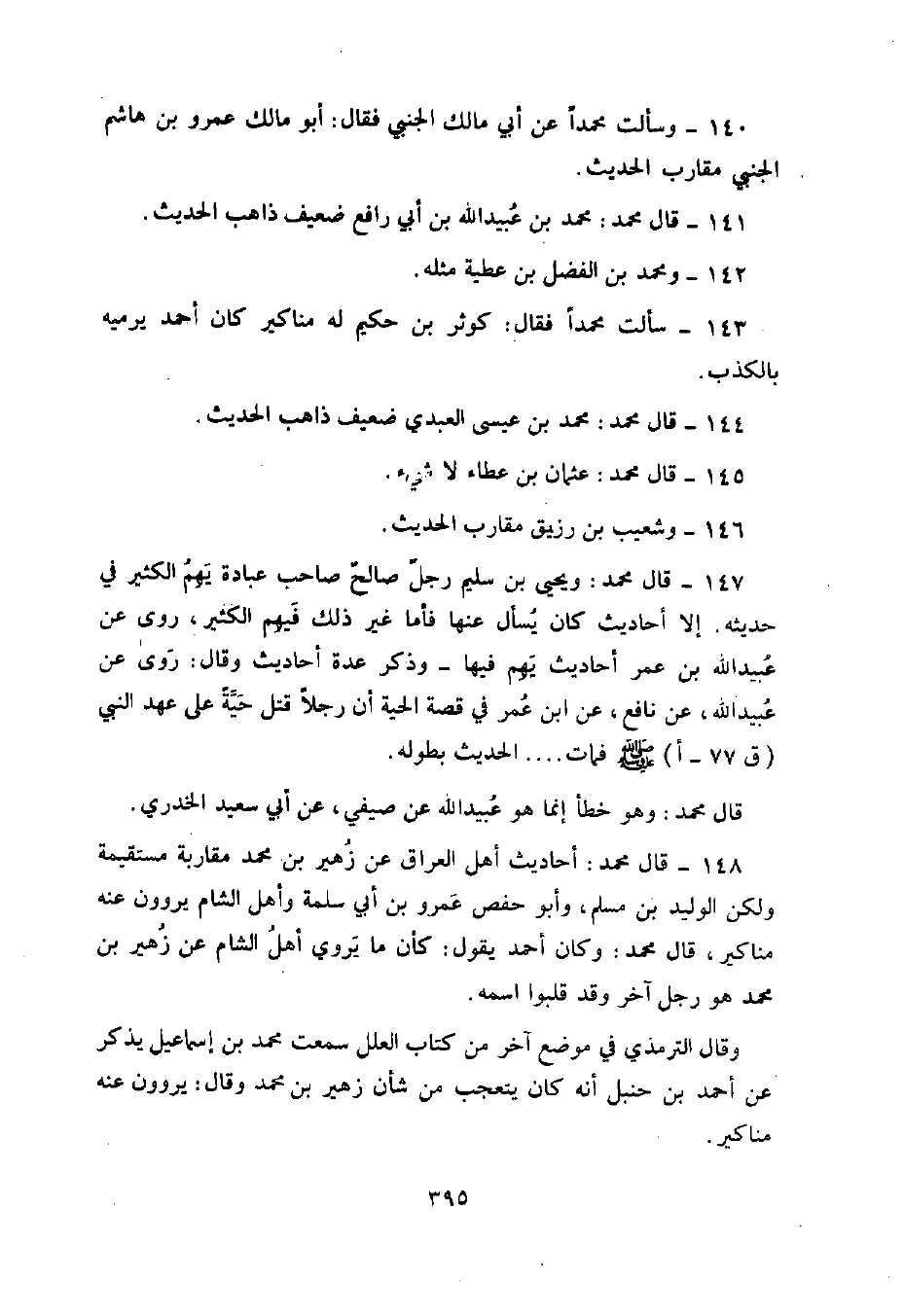 وَسَأَلْتُ مُحَمَّدًا عَنْ أَبِي مَالِكٍ الْجَنْبِيِّ , فَقَالَ: أَبُو مَالِكٍ عَمْرُو بْنُ هَاشِمٍ الْجَنْبِيُّ مُقَارِبُ الْحَدِيثِ. قَالَ مُحَمَّدٌ: مُحَمَّدُ بْنُ عُبَيْدِ اللَّهِ بْنِ أَبِي رَافِعٍ ضَعِيفٌ ذَاهِبُ الْحَدِيثِ وَمُحَمَّدُ بْنُ الْفَضْلِ بْنِ عَطِيَّةَ مِثْلُهُ. سَأَلْتُ مُحَمَّدًا فَقَالَ: كَوْثَرُ بْنُ حَكِيمٍ لَهُ مَنَاكِيرُ , كَانَ أَحْمَدُ يَرْمِيَهُ بِالْكَذِبِ. قَالَ مُحَمَّدٌ: مُحَمَّدُ بْنُ عِيسَى الْعَبْدِيُّ ضَعِيفٌ ذَاهِبُ الْحَدِيثِ. قَالَ مُحَمَّدٌ: عُثْمَانُ بْنُ عَطَاءٍ لَا شَيْءَ. وَشُعَيْبُ بْنُ رُزَيْقٍ مُقَارِبُ الْحَدِيثِ. قَالَ مُحَمَّدٌ: وَيَحْيَى بْنُ سُلَيْمٍ رَجُلٌ صَالِحٌ صَاحِبُ عُبَادَةٍ يَهِمُ الْكَثِيرَ فِي حَدِيثِهِ إِلَّا أَحَادِيثَ كَانَ يَسْأَلُ عَنْهَا , فَأَمَّا غَيْرَ ذَلِكَ فَيَهِمُ الْكَثِيرَ , رَوَى عَنْ عُبَيْدِ اللَّهِ بْنِ عُمَرَ أَحَادِيثَ يَهِمُ فِيهَا , وَذَكَرَ عِدَّةَ أَحَادِيثَ وَقَالَ: رَوَى عَنْ عُبَيْدِ اللَّهِ , عَنْ نَافِعٍ , عَنِ ابْنِ عُمَرَ فِي قِصَّةِ الْحَيَّةِ أَنَّ رَجُلًا قَتَلَ حَيَّةً عَلَى عَهْدِ النَّبِيِّ صَلَّى اللهُ عَلَيْهِ وَسَلَّمَ فَمَاتَ. الْحَدِيثُ بِطُولِهِ. قَالَ مُحَمَّدٌ: وَهُوَ خَطَأٌ إِنَّمَا هُوَ عُبَيْدُ اللَّهِ , عَنْ صَيْفِيٍّ , عَنْ أَبِي سَعِيدٍ الْخُدْرِيِّ. قَالَ مُحَمَّدٌ: أَحَادِيثُ أَهْلِ الْعِرَاقِ , عَنْ زُهَيْرِ بْنِ مُحَمَّدٍ , مُقَارِبَةٌ مُسْتَقِيمَةٌ وَلَكِنِ الْوَلِيدُ بْنُ مُسْلِمٍ وَأَبُو حَفْصٍ عَمْرُو بْنُ أَبِي سَلَمَةَ وَأَهْلُ الشَّامِ يَرْووُنَ عَنْهُ مَنَاكِيرَ , قَالَ مُحَمَّدٌ: وَكَانَ أَحْمَدُ يَقُولُ: كَأَنَّ مَا يَرْوِي أَهْلُ الشَّامِ عَنْ زُهَيْرِ بْنِ مُحَمَّدٍ هُوَ رَجُلٌ آخَرُ , وَقَدْ قَلَبُوا اسْمَهُ. وَقَالَ التِّرْمِذِيُّ فِي مَوْضِعٍ آخَرَ مِنْ كِتَابِ الْعِلَلِ: سَمِعْتُ مُحَمَّدَ بْنَ إِسْمَاعِيلَ يَذْكُرُ عَنْ أَحْمَدَ بْنِ حَنْبَلٍ أَنَّهُ كَانَ يَتَعَجَّبُ مِنْ شَأْنِ زُهَيْرِ بْنِ مُحَمَّدٍ , وَقَالَ: يَرْووُنَ عَنْهُ مَنَاكِيرَ ,