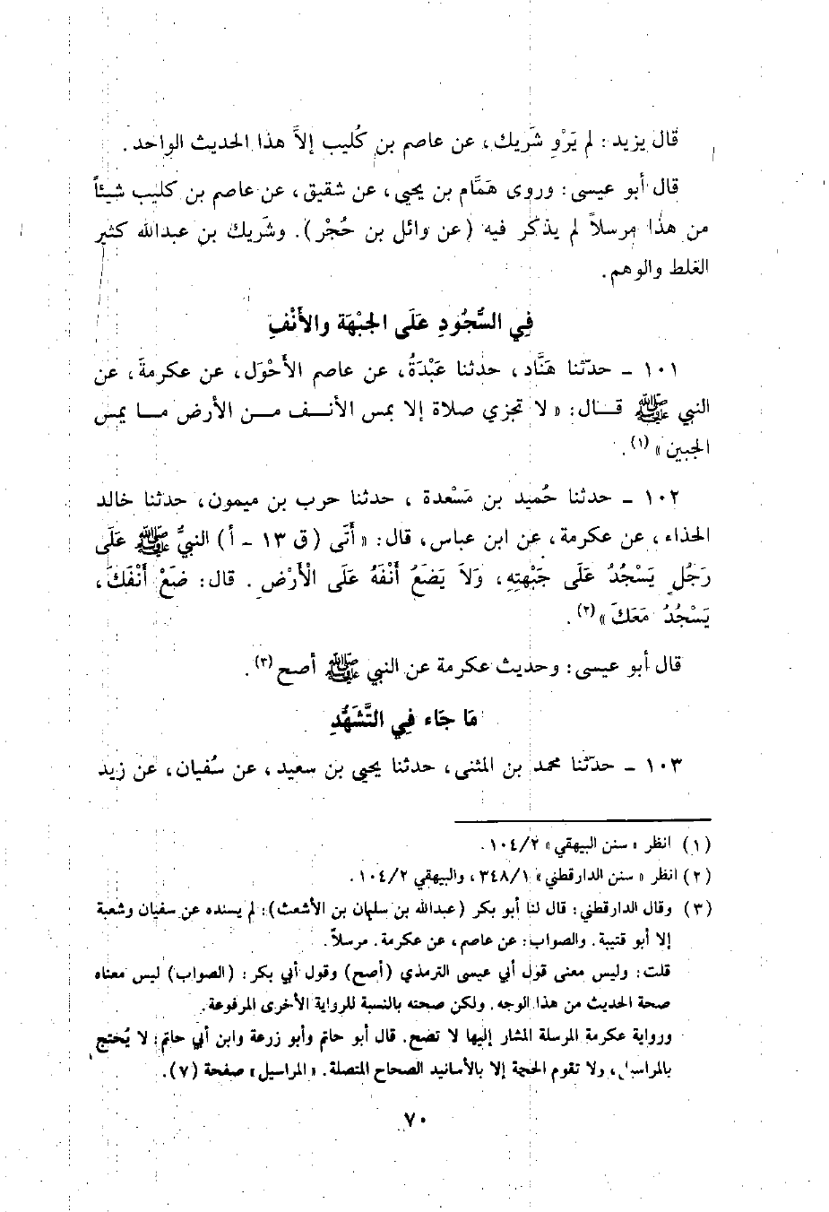 101 - حَدَّثَنَا هَنَّادٌ , حَدَّثَنَا عَبْدَةُ , عَنْ عَاصِمٍ الْأَحْوَلِ , عَنْ عِكْرِمَةَ , عَنِ النَّبِيِّ صَلَّى اللهُ عَلَيْهِ وَسَلَّمَ قَالَ: «§لَا تَجْزِي صَلَاةٌ إِلَّا بِمَسِّ الْأَنْفِ مِنَ الْأَرْضِ مَا يَمَسُّ الْجَبِينُ»