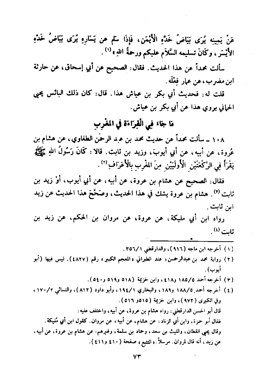 108 - سَأَلْتُ مُحَمَّدًا عَنْ حَدِيثِ مُحَمَّدِ بْنِ عَبْدِ الرَّحْمَنِ الطُّفَاوِيِّ , عَنْ هِشَامِ بْنِ عُرْوَةَ , عَنْ أَبِيهِ , عَنْ أَبِي أَيُّوبَ , وَزَيْدِ بْنِ ثَابِتٍ , قَالَا: كَانَ رَسُولُ اللَّهِ صَلَّى اللهُ عَلَيْهِ وَسَلَّمَ يَقْرَأُ فِي الرَّكْعَتَيْنِ الْأُولَيَيْنِ مِنَ الْمَغْرِبِ بِالْأَعْرَافِ فَقَالَ: الصَّحِيحُ عَنْ هِشَامِ بْنِ عُرْوَةَ , عَنْ أَبِيهِ , عَنْ أَبِي أَيُّوبَ أَوْ زَيْدِ بْنِ ثَابِتٍ. هِشَامُ بْنُ عُرْوَةَ يَشُكُّ فِي هَذَا الْحَدِيثِ. وَصَحَّحَ هَذَا الْحَدِيثَ عَنْ زَيْدِ بْنِ ثَابِتٍ رَوَاهُ ابْنُ أَبِي مُلَيْكَةَ , عَنْ عُرْوَةَ , عَنْ مَرْوَانَ بْنِ الْحَكَمِ , عَنْ زَيْدِ بْنِ ثَابِتٍ