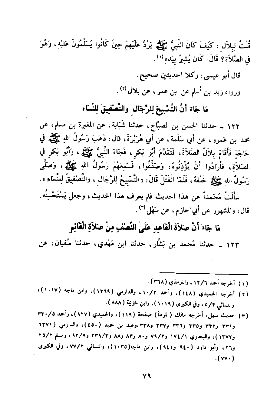 122 - حَدَّثَنَا الْحَسَنُ بْنُ الصَّبَّاحِ , حَدَّثَنَا شَبَابَةُ , عَنِ الْمُغِيرَةِ بْنِ مُسْلِمٍ , عَنْ مُحَمَّدِ بْنِ عَمْرٍو , عَنْ أَبِي سَلَمَةَ , عَنْ أَبِي هُرَيْرَةَ , قَالَ: ذَهَبَ رَسُولُ اللَّهِ صَلَّى اللهُ عَلَيْهِ وَسَلَّمَ فِي حَاجَةٍ فَأَقَامَ بِلَالٌ الصَّلَاةَ فَتَقَدَّمَ أَبُو بَكْرٍ فَجَاءَ النَّبِيُّ صَلَّى اللهُ عَلَيْهِ وَسَلَّمَ وَأَبُو بَكْرٍ فِي الصَّلَاةِ فَأَرَادُوا أَنْ يَؤْذِنُوهُ وَصَفَّقُوا , فَسَمِعَهُمْ رَسُولُ اللَّهِ صَلَّى اللهُ عَلَيْهِ وَسَلَّمَ وَصَلَّى رَسُولُ اللَّهِ صَلَّى اللهُ عَلَيْهِ وَسَلَّمَ خَلْفَهُ , فَلَمَّا انْفَتَلَ قَالَ: «§التَّسْبِيحُ لِلرِّجَالِ وَالتَّصْفِيقُ لِلنِّسَاءِ» . سَأَلْتُ مُحَمَّدًا عَنْ هَذَا الْحَدِيثِ فَلَمْ يَعْرِفْ هَذَا الْحَدِيثَ وَجَعَلَ يَسْتَحْسِنُهُ. قَالَ: وَالْمَشْهُورُ عَنْ أَبِي حَازِمٍ , عَنْ سَهْلٍ