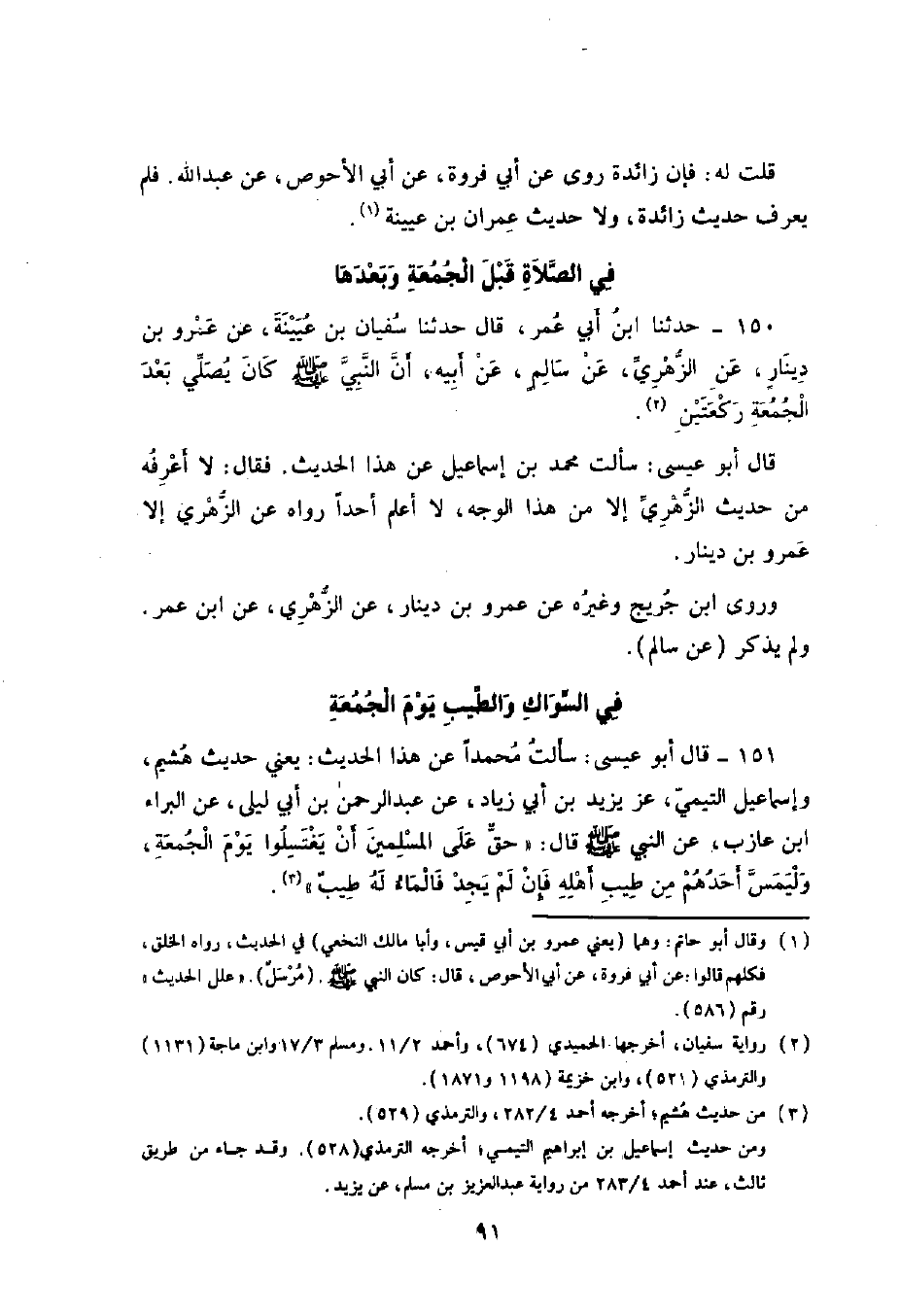 151 - قَالَ أَبُو عِيسَى: سَأَلْتُ مُحَمَّدًا عَنْ هَذَا الْحَدِيثِ يَعْنِي: حَدِيثَ هُشَيْمٍ , وَإِسْمَاعِيلَ التَّيْمِيِّ عَنْ يَزِيدَ بْنِ أَبِي زِيَادٍ , عَنْ عَبْدِ الرَّحْمَنِ بْنِ أَبِي لَيْلَى , عَنِ الْبَرَاءِ بْنِ عَازِبٍ , عَنِ النَّبِيِّ صَلَّى اللهُ عَلَيْهِ وَسَلَّمَ قَالَ: «حَقٌّ عَلَى الْمُسْلِمِينَ أَنْ يَغْتَسِلُوا يَوْمَ الْجُمُعَةِ , وَلْيَمَسَّ أَحَدُهُمْ مِنْ طِيبِ أَهْلِهِ فَإِنْ لَمْ يَجِدْ فَالْمَاءُ لَهُ طِيبٌ» -[92]-. فَقَالَ: الصَّحِيحُ عَنِ ابْنِ أَبِي لَيْلَى , عَنِ الْبَرَاءِ مَوْقُوفٌ , وَإِسْمَاعِيلُ بْنُ إِبْرَاهِيمَ التَّيْمِيُّ ذَاهِبُ الْحَدِيثِ , كَانَ ابْنُ نُمَيْرٍ يُضَعِّفُهُ جِدًّا , وَلَمْ يُعْرَفُ حَدِيثُ هُشَيْمٍ , عَنْ يَزِيدَ بْنِ أَبِي زِيَادٍ , وَحَدِيثُ هُشَيْمٍ أَصَحُّ وَأَحْسَنُ مِنْ حَدِيثِ إِسْمَاعِيلَ