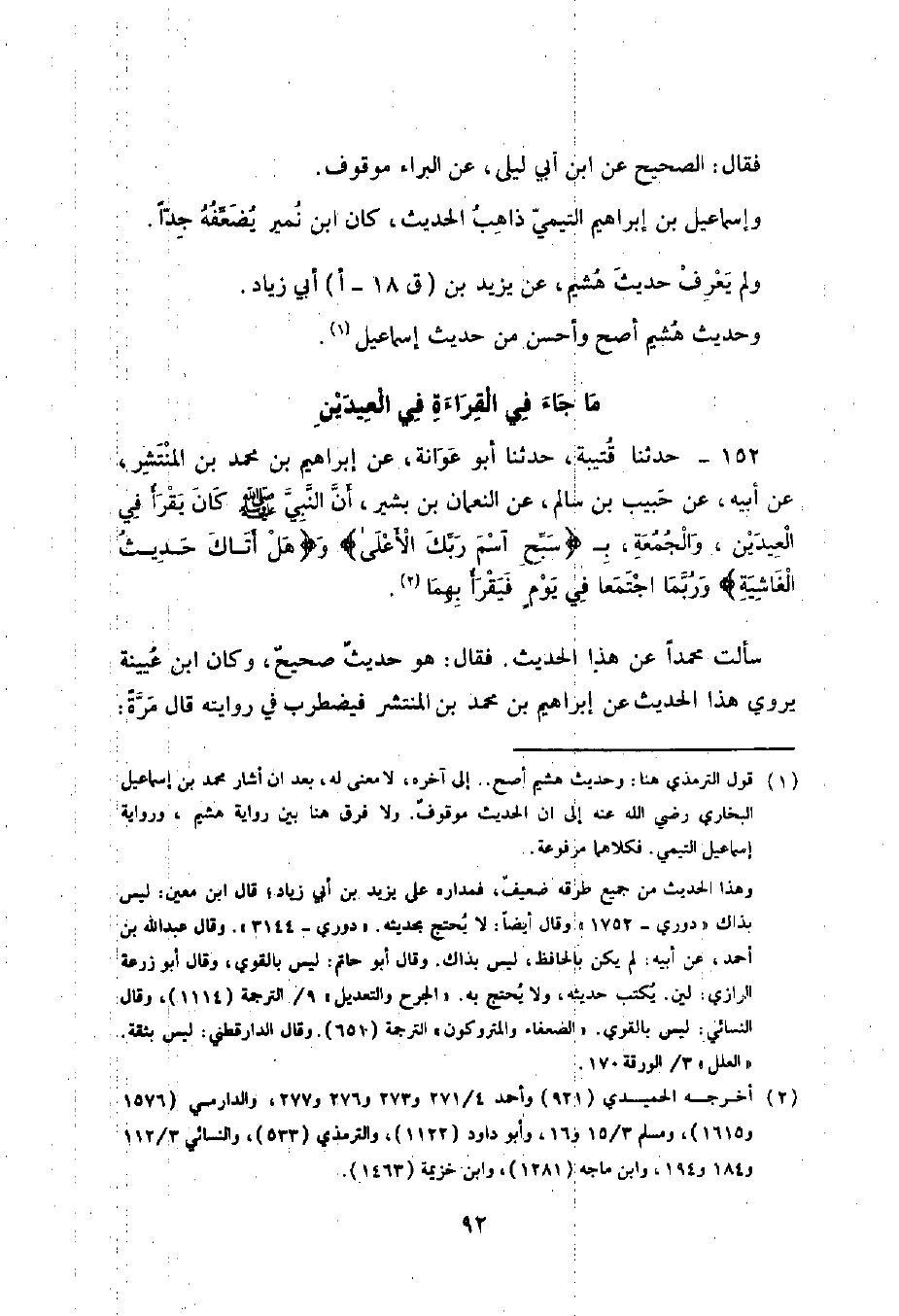 152 - حَدَّثَنَا قُتَيْبَةُ , حَدَّثَنَا أَبُو عَوَانَةَ , عَنْ إِبْرَاهِيمَ بْنِ مُحَمَّدِ بْنِ الْمُنْتَشِرِ , عَنْ أَبِيهِ , عَنْ حَبِيبِ بْنِ سَالِمٍ , عَنِ النُّعْمَانِ بْنِ بَشِيرٍ , أَنَّ النَّبِيَّ صَلَّى اللهُ عَلَيْهِ وَسَلَّمَ §كَانَ يَقْرَأَ فِي الْعِيدَيْنِ وَالْجُمُعَةِ بِسَبِّحِ اسْمَ رَبِّكَ الْأَعْلَى , وَهَلْ أَتَاكَ حَدِيثُ الْغَاشِيَةِ , وَرُبَّمَا اجْتَمَعَا فِي يَوْمٍ فَيَقْرَأُ بِهِمَا " سَأَلْتُ مُحَمَّدًا عَنْ هَذَا الْحَدِيثِ فَقَالَ: هُوَ حَدِيثٌ صَحِيحٌ وَكَانَ ابْنُ عُيَيْنَةَ يَرْوِي هَذَا الْحَدِيثَ عَنْ إِبْرَاهِيمَ بْنِ مُحَمَّدِ بْنِ الْمُنْتَشِرِ فَيَضْطَرِبُ فِي رِوَايَتِهِ. قَالَ مَرَّةً حَبِيبُ بْنُ سَالِمٍ , عَنْ أَبِيهِ , عَنِ النُّعْمَانِ بْنِ بَشِيرٍ وَهُوَ وَهْمٌ , وَالصَّحِيحُ حَبِيبُ بْنُ سَالِمٍ , عَنِ النُّعْمَانِ بْنِ بَشِيرٍ