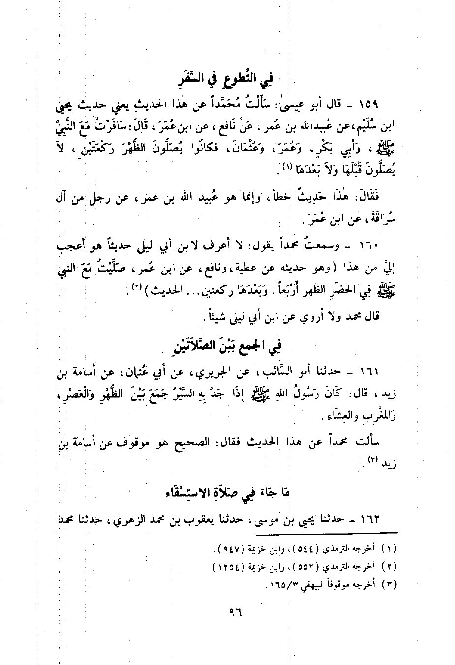 159 - قَالَ أَبُو عِيسَى: سَأَلْتُ مُحَمَّدًا عَنْ هَذَا الْحَدِيثِ يَعْنِي: حَدِيثَ يَحْيَى بْنِ سُلَيْمٍ , عَنْ عُبَيْدِ اللَّهِ بْنِ عُمَرَ , عَنْ نَافِعٍ , عَنِ ابْنِ عُمَرَ , قَالَ: سَافَرْتُ مَعَ النَّبِيِّ صَلَّى اللهُ عَلَيْهِ وَسَلَّمَ , وَأَبِي بَكْرٍ , وَعُمَرَ , وَعُثْمَانَ , فَكَانُوا يُصَلُّونَ الظُّهْرَ رَكْعَتَيْنِ لَا يُصَلُّونَ قَبْلَهَا وَلَا بَعْدَهَا. فَقَالَ: هَذَا حَدِيثٌ خَطَأٌ , وَإِنَّمَا هُوَ عُبَيْدُ اللَّهِ بْنُ عُمَرَ , عَنْ رَجُلٍ مِنْ آلِ سُرَاقَةَ , عَنِ ابْنِ عُمَرَ.