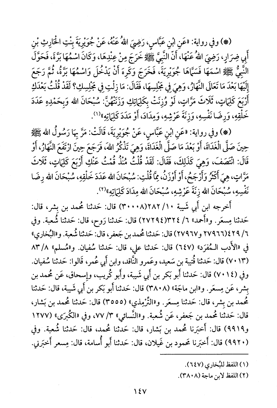 - وفي رواية: «عن ابن عباس، رضي الله عنه، عن جويرية بنت الحارث بن أبي ضرار، رضي الله عنها، أن النبي صَلى الله عَليه وسَلم خرج من عندها، وكان اسمها برة، فحول النبي صَلى الله عَليه وسَلم اسمها فسماها جويرية، فخرج وكره أن يدخل واسمها برة، ثم رجع إليها بعد ما تعالى النهار، وهي في مجلسها، فقال: ما زلت في مجلسك؟ لقد قلت بعدك أربع كلمات، ثلاث مرات، لو وزنت بكلماتك وزنتهن: سبحان الله وبحمده عدد خلقه، ورضا نفسه، وزنة عرشه، ومداد، أو مدد كلماته» (¬١).
