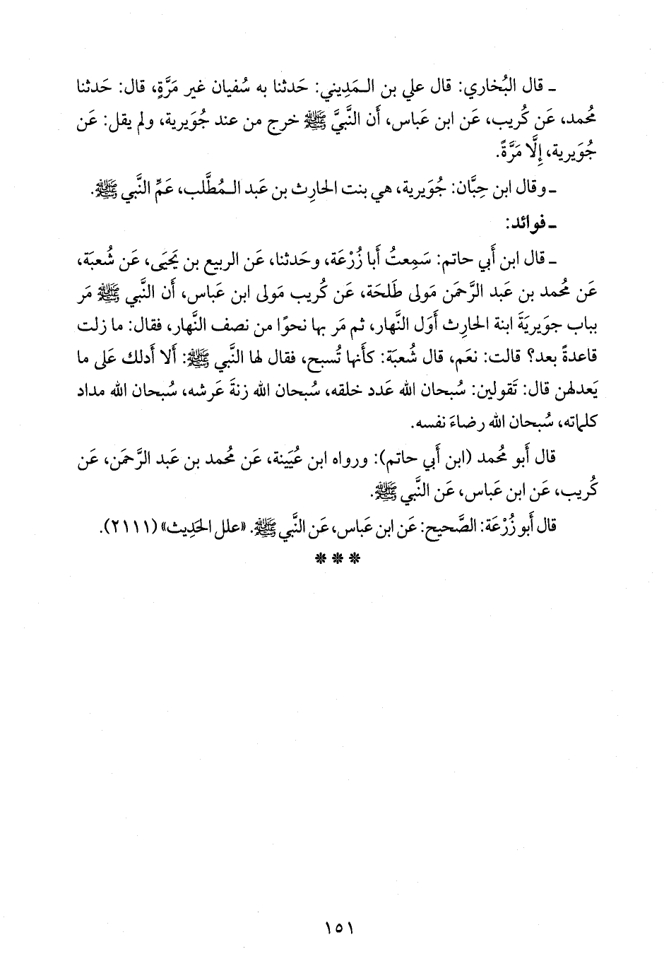 - قال ابن أبي حاتم: سمعت أَبا زُرعَة، وحدثنا، عن الربيع بن يحيى، عن شعبة، عن محمد بن عبد الرَّحمَن مولى طلحة، عن كُريب مولى ابن عباس، أن النبي صَلى الله عَليه وسَلم مر بباب جويرية ابنة الحارث أول النهار، ثم مر بها نحوا من نصف النهار، فقال: ما زلت قاعدة بعد؟ قالت: نعم، قال شعبة: كأنها تسبح، فقال لها النبي صَلى الله عَليه وسَلم: ألا أدلك على ما يعدلهن قال: تقولين: سبحان الله عدد خلقه، سبحان الله زنة عرشه، سبحان الله مداد كلماته، سبحان الله رضاء نفسه.