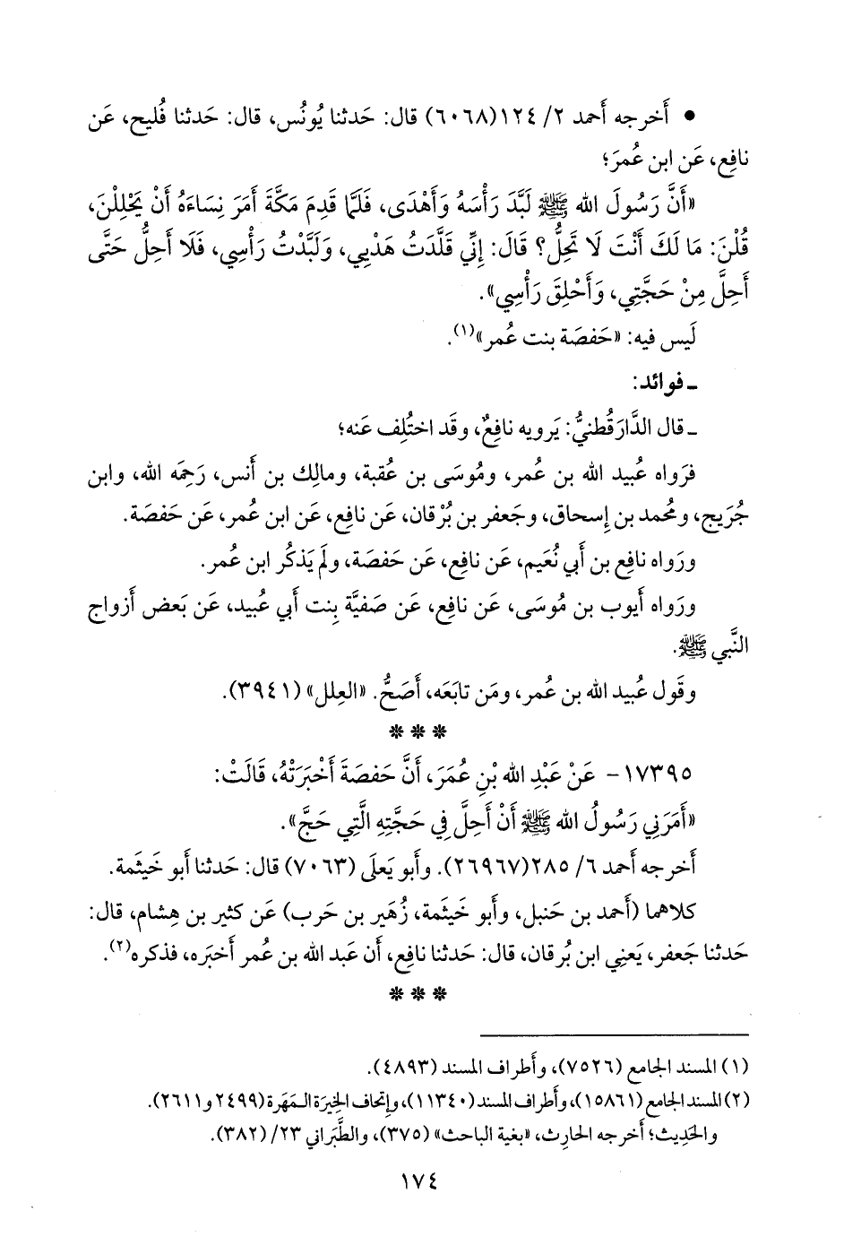 - سُئل الدارَقُطني عن حديث ابن عُمر، عن حفصة، قالت: قُلت: يا رسول الله، ما شأن الناس حَلوا ولم تَحِل من عُمرَتك، قال: إِني قَلَّدتُ هَديي، ولَبَّدتُ رأسي، فلا أَحِل حتى أَحِل من الحج.
