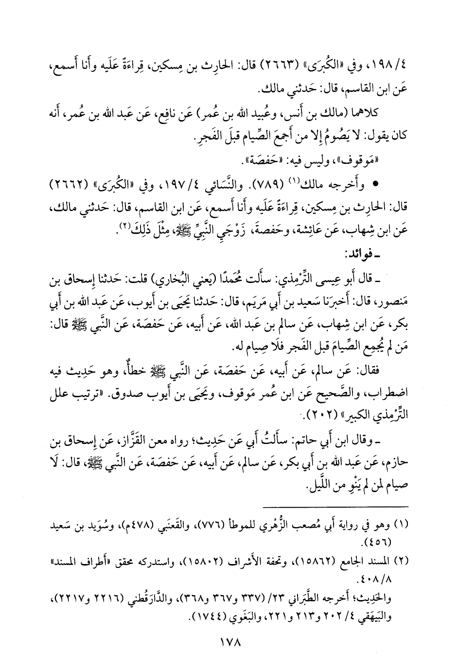 - قال التِّرمِذي: سألتُ محمدًا، يعني ابن إسماعيل البخاري، قلت: حدثنا إسحاق بن منصور، قال: أخبرنا سعيد بن أبي مريم، قال: حدثنا يحيى بن أيوب، عن عبد الله بن أَبي بكر، عن ابن شهاب، عن سالم بن عبد الله، عن أبيه، عن حفصة، عن النبي صَلى الله عَليه وسَلم قال: من لم يجمع الصيام قبل الفجر فلا صيام له.