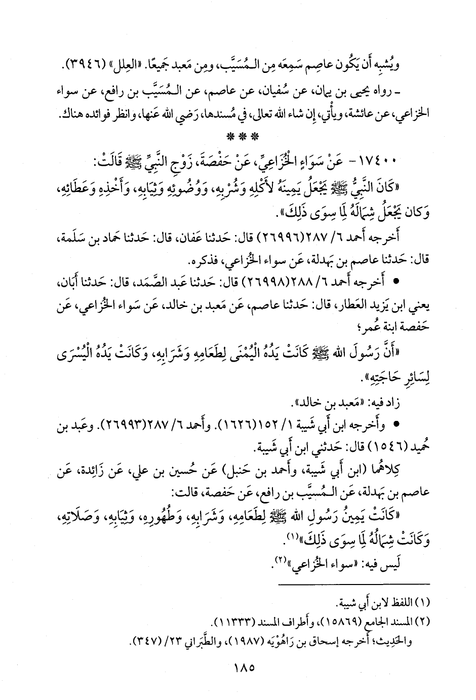 كلاهما (ابن أبي شيبة، وأحمد بن حنبل) عن حسين بن علي، عن زائدة، عن عاصم بن بهدلة، عن المُسَيَّب بن رافع، عن حفصة، قالت: