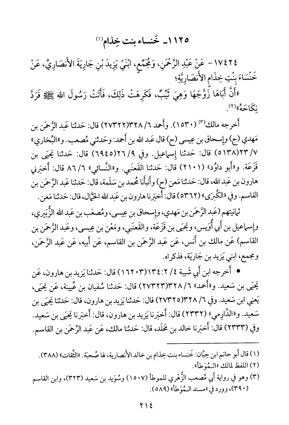 و «البخاري» ٧/ ٢٣ (٥١٣٩) قال: حدثنا إسحاق, قال: أخبرنا يزيد, قال: أخبرنا يحيى. وفي ٩/ ٣٢ (٦٩٦٩) قال: حدثنا علي بن عبد الله, قال: حدثنا سفيان, قال: حدثنا يحيى بن سعيد (قال سفيان: وأما عبد الرَّحمَن فسمعته يقول، عن أبيه: إن خنساء). و «ابن ماجة» (١٨٧٣) قال: حدثنا أَبو بكر بن أبي شيبة, قال: حدثنا يزيد بن هارون، عن يحيى بن سعيد.