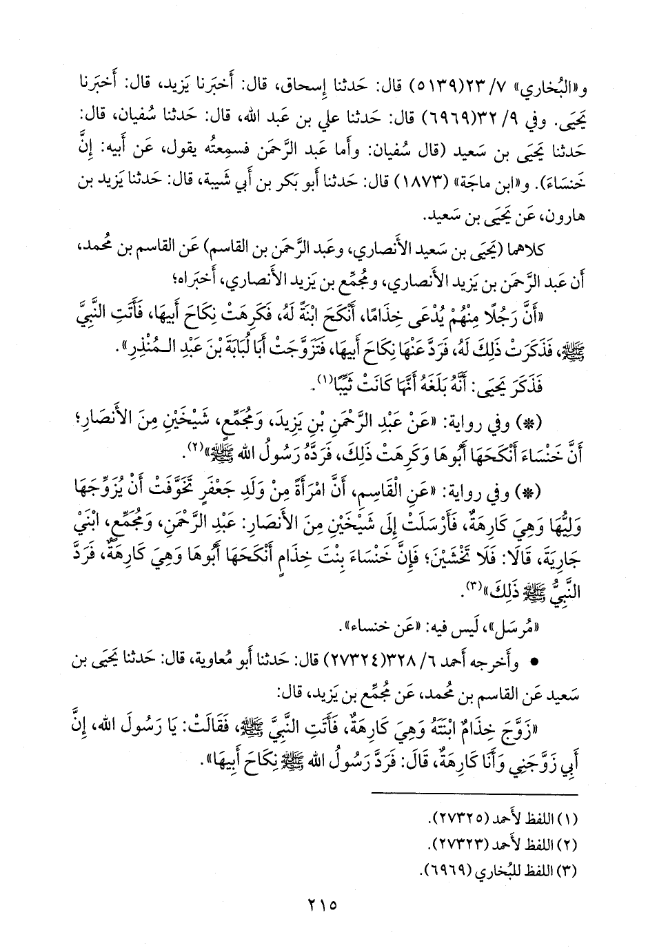 - وفي رواية: «عن القاسم، أن امرأة من ولد جعفر تخوفت أن يزوجها وليها وهي كارهة، فأرسلت إلى شيخين من الأنصار: عبد الرَّحمَن، ومجمع، ابني جارية، قالا: فلا تخشين؛ فإن خنساء بنت خذام أنكحها أَبوها وهي كارهة، فرد النبي صَلى الله عَليه وسَلم ذلك» (¬١).