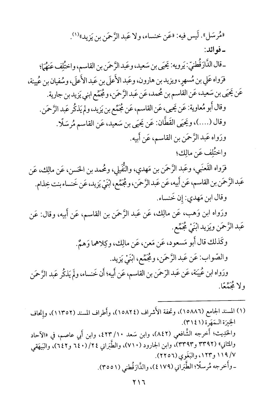 فرواه القَعنَبي، وعبد الرَّحمَن بن مهدي، والنُّفيلي، ومحمد بن الحسن، عن مالك، عن عبد الرَّحمَن بن القاسم، عن أَبيه، عن عبد الرَّحمَن، ومُجَمِّع، ابني يزيد، عن خَنساء بنت خِذام.