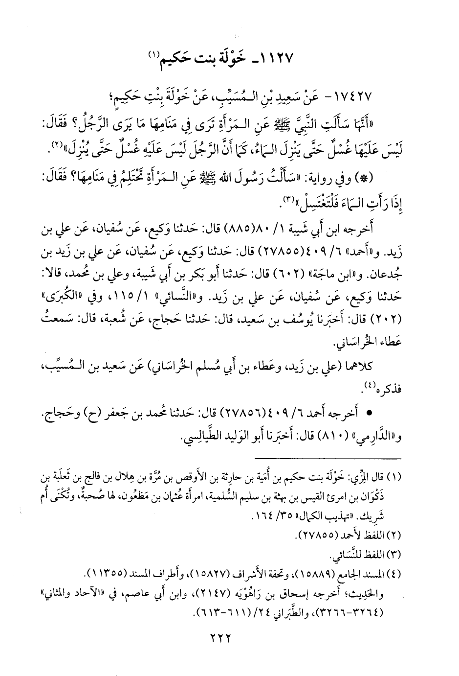 «أن خولة بنت حكيم السلمية، وهي إحدى خالات النبي صَلى الله عَليه وسَلم سألت النبي صَلى الله عَليه وسَلم عن المرأة تحتلم؟ فقال رسول الله صَلى الله عَليه وسَلم لتغتسل» (¬٢). «مُرسَل» (¬٣).