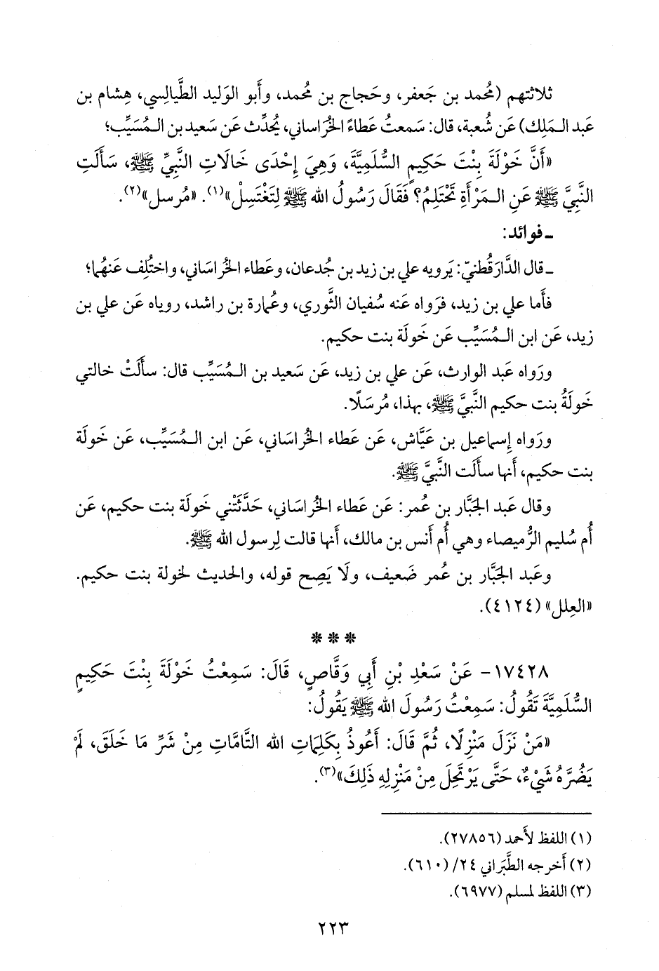 فأما علي بن زيد، فرواه عنه سفيان الثوري، وعمارة بن راشد، روياه عن علي بن زيد، عن ابن المُسَيب عن خولة بنت حكيم.