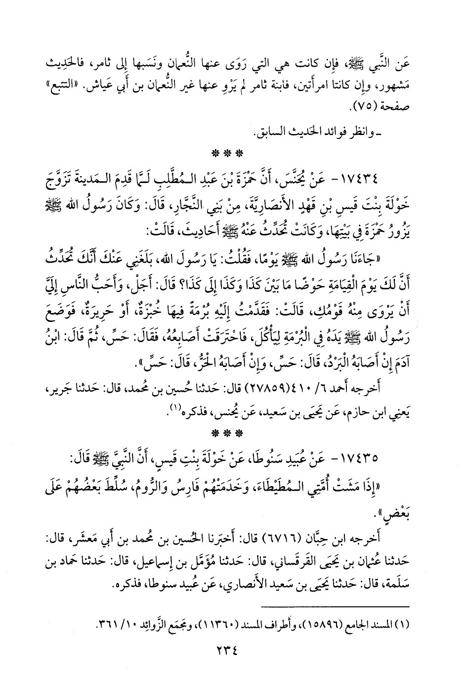 ١٧٤٣٤ - عن يحنس، أن حمزة بن عبد المطلب لما قدم المدينة تزوج خولة بنت قيس بن قَهْد الأَنصارية، من بني النجار، قال: وكان رسول الله صَلى الله عَليه وسَلم يزور حمزة في بيتها، وكانت تحدث عنه صَلى الله عَليه وسَلم أحاديث، قالت: