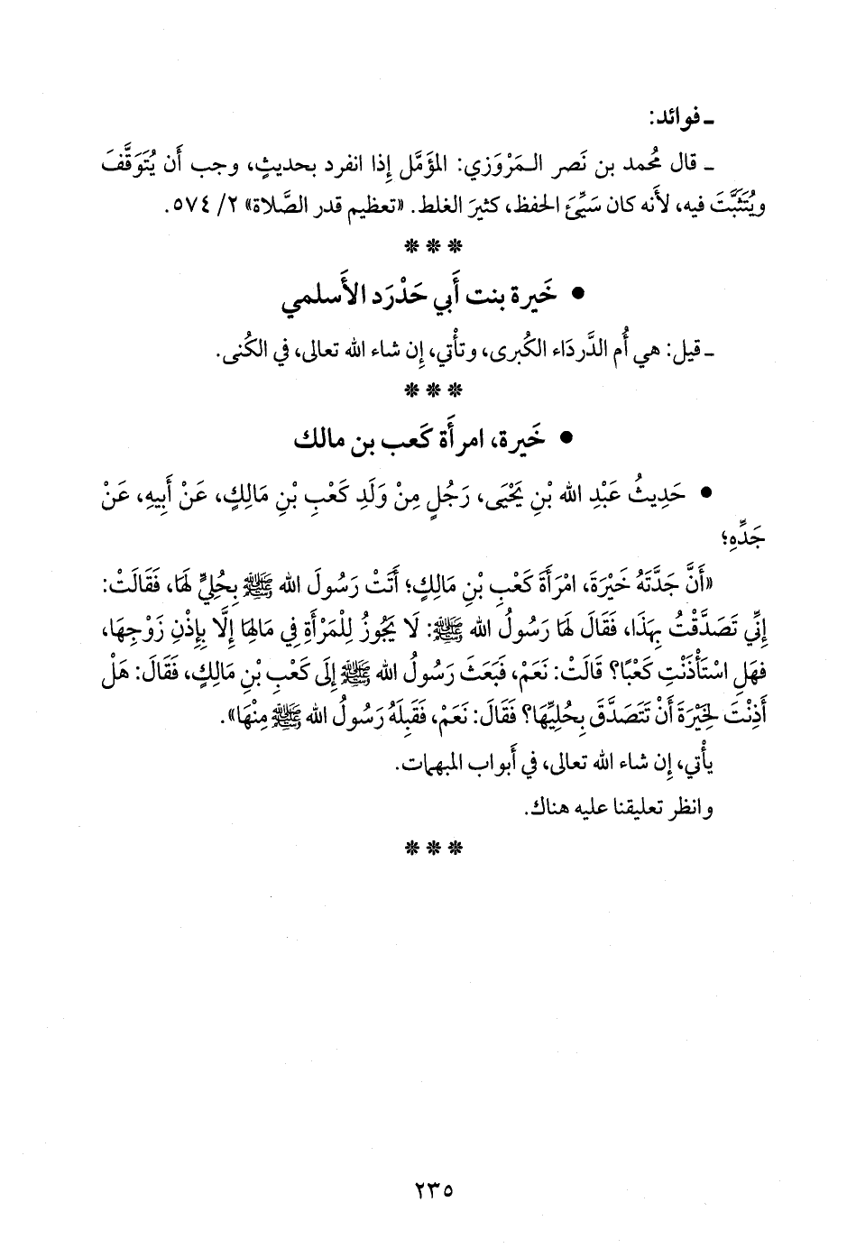 «أن جدته خيرة، امرأة كعب بن مالك؛ أتت رسول الله صَلى الله عَليه وسَلم بحلي لها، فقالت: إني تصدقت بهذا، فقال لها رسول الله صَلى الله عَليه وسَلم: لا يجوز للمرأة في مالها إلا بإذن زوجها، فهل استاذنت كعبا؟ قالت: نعم، فبعث رسول الله صَلى الله عَليه وسَلم إلى كعب بن مالك، فقال: هل أذنت لخيرة أن تتصدق بحليها؟ فقال: نعم، فقبله رسول الله صَلى الله عَليه وسَلم منها».