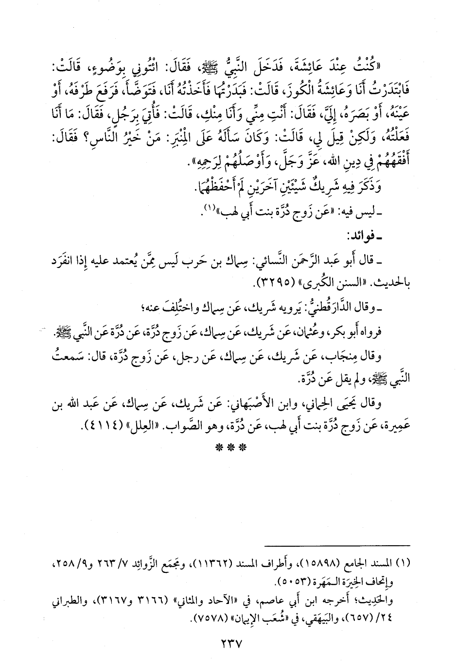 وقال يحيى الحماني، وابن الأصبهاني: عن شريك، عن سِمَاك، عن عبد الله بن عَمِيرة، عن زوج درة بنت أبي لهب، عن درة، وهو الصواب. «العلل» (٤١١٤).