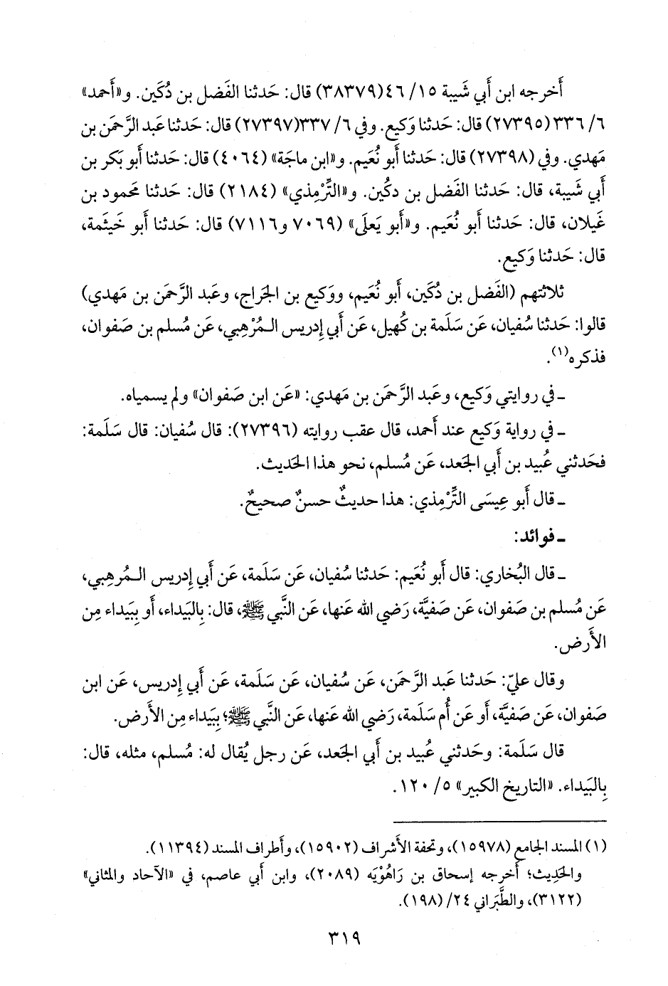 - قال البخاري: قال أَبو نُعيم: حدثنا سفيان، عن سلمة، عن أبي إدريس المرهبي، عن مسلم بن صفوان، عن صفية، رضي الله عنها، عن النبي صَلى الله عَليه وسَلم قال: بالبيداء، أو ببيداء من الأرض.