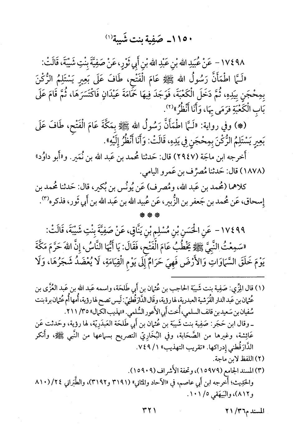 (¬١) قال المِزِّي: صفية بنت شيبة الحاجب بن عثمان بن أبي طلحة، واسمه عبد الله بن عبد العزى بن عثمان بن عبد الدار القرشية العبدرية، لها رؤية، وقال الدارقُطني: ليس تصح لها رؤية، أمها أم عثمان برة بنت سفيان بن سعيد بن قانف السلمي، أخت أبي الأعور السلمي. «تهذيب الكمال» ٣٥/ ٢١١.