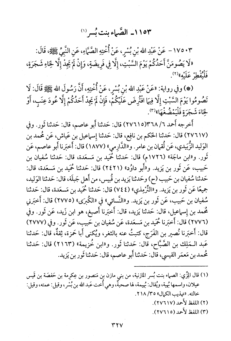 - وفي رواية: «عن عبد الله بن بسر، عن أخته، أن رسول الله صَلى الله عَليه وسَلم قال: لا تصوموا يوم السبت إلا فيما افترض عليكم، فإن لم يجد أحدكم إلا عود عنب، أو لحاء شجرة فليمضغها» (¬٣).