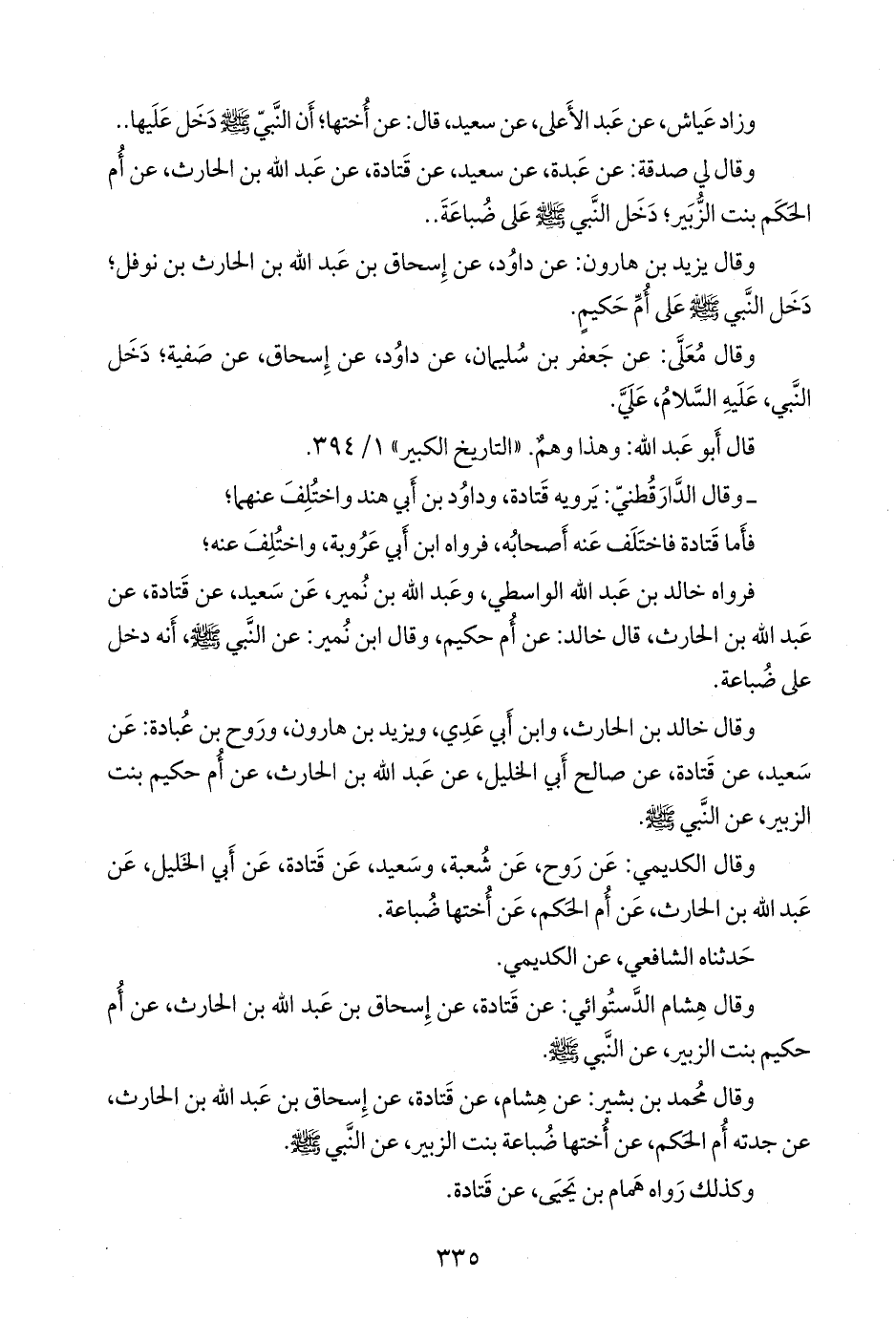 فرواه خالد بن عبد الله الواسطي، وعبد الله بن نُمير، عن سعيد، عن قتادة، عن عبد الله بن الحارث، قال خالد: عن أم حكيم، وقال ابن نُمير: عن النبي صَلى الله عَليه وسَلم أنه دخل على ضباعة.