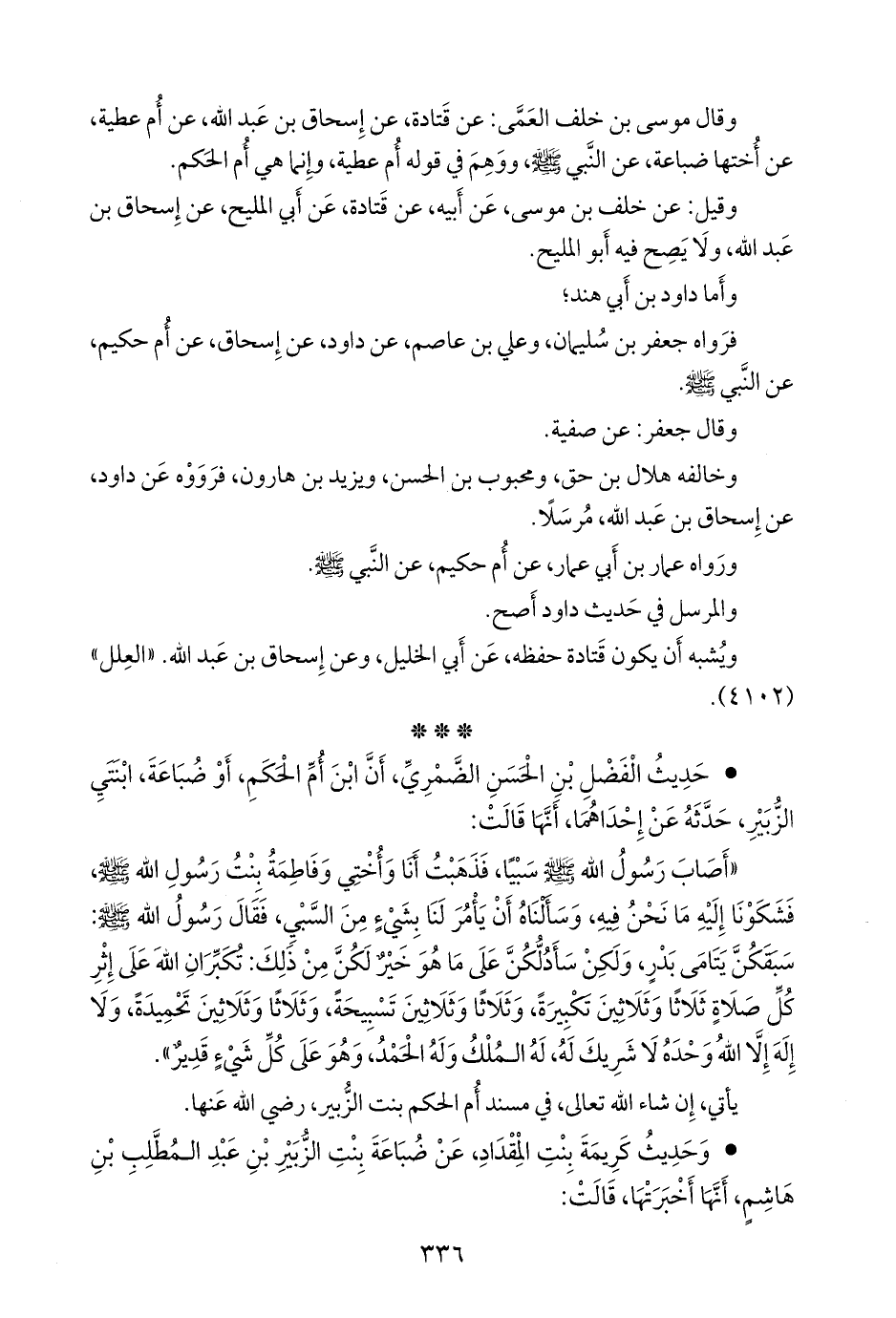 • وحديث كريمة بنت المقداد، عن ضباعة بنت الزبير بن عبد المطلب بن هاشم، أنها أخبرتها، قالت: