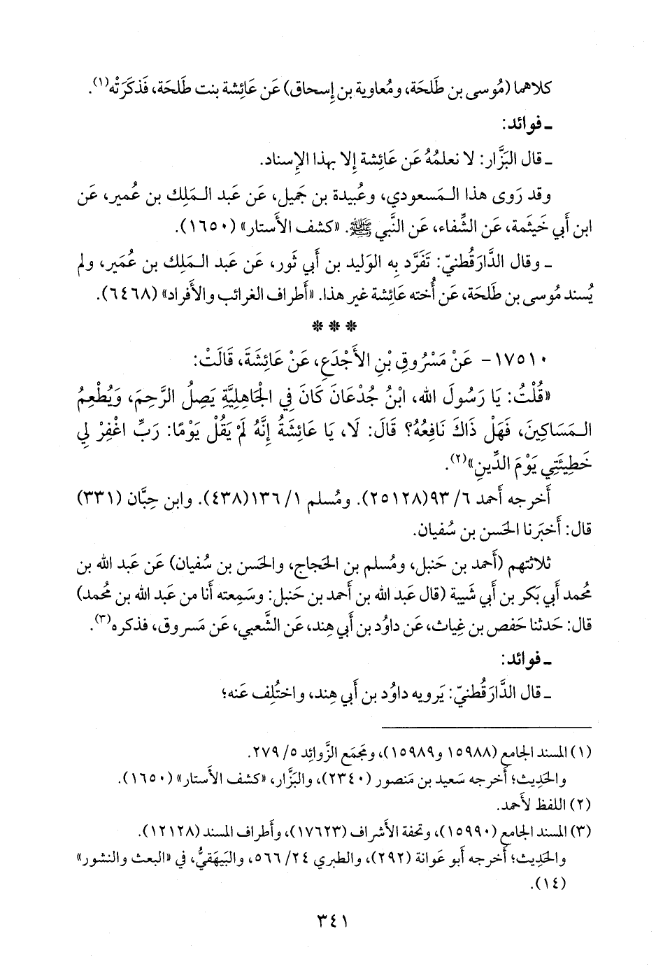 ثلاثتهم (أحمد بن حنبل، ومسلم بن الحجاج، والحسن بن سفيان) عن عبد الله بن محمد أَبي بكر بن أبي شيبة (قال عبد الله بن أحمد بن حنبل: وسمعتُه أنا من عبد الله بن محمد) قال: حدثنا حفص بن غياث، عن داود بن أبي هند، عن الشعبي، عن مسروق، فذكره (¬٢).