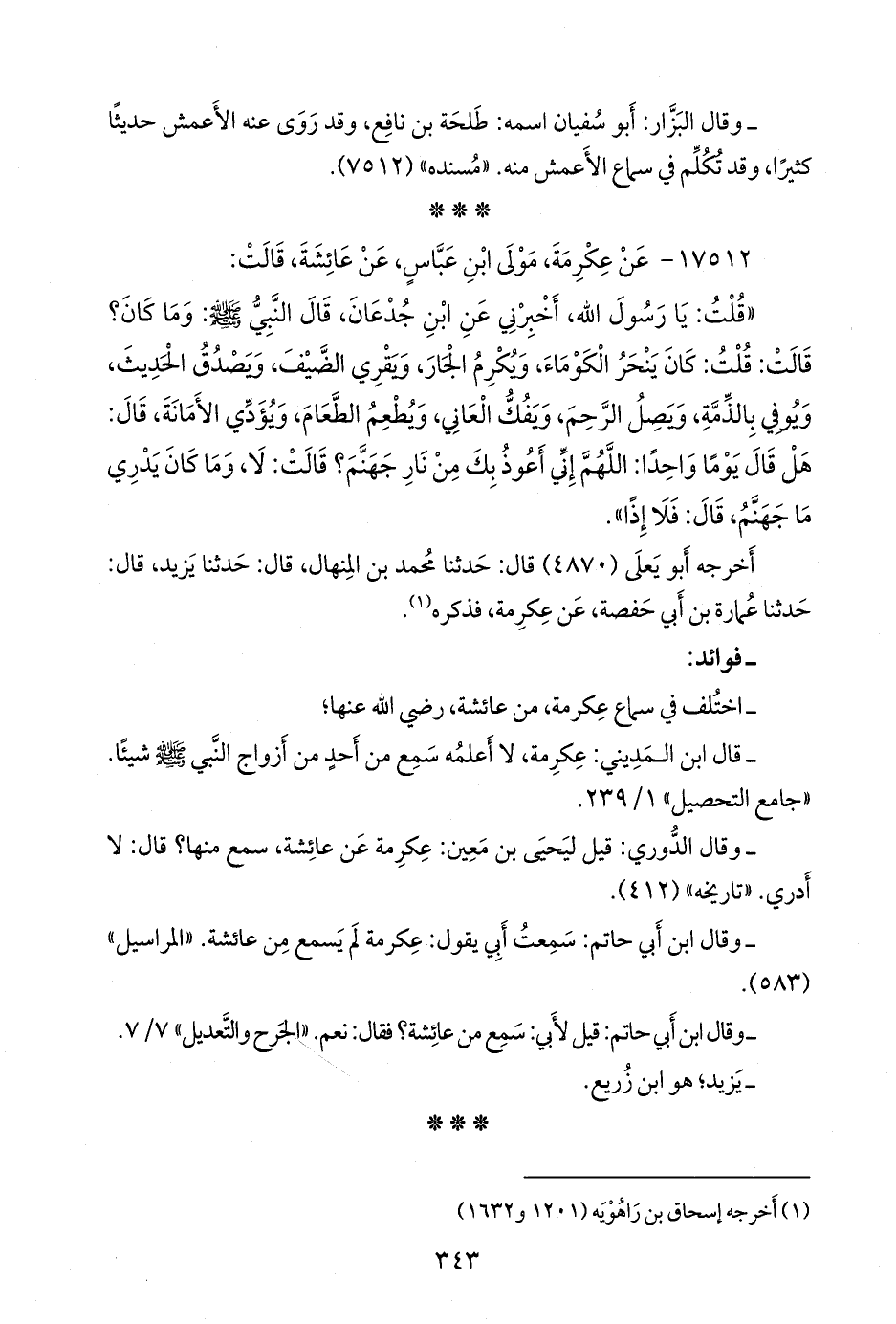 - وقال ابن أبي حاتم: سمعت أبي يقول: عكرمة لم يسمع من عائشة. «المراسيل» (٥٨٣).