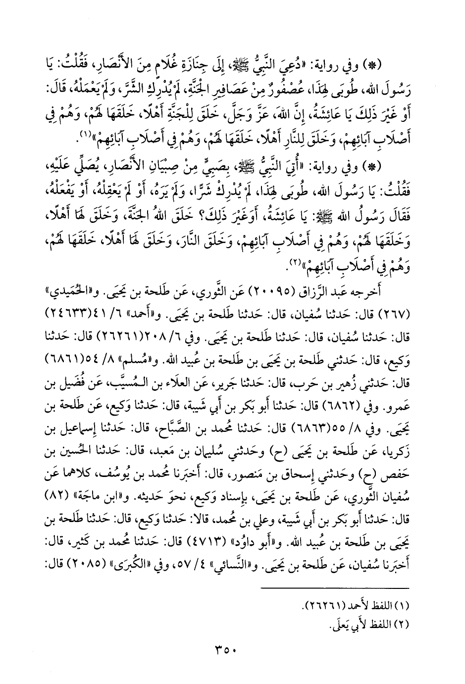 - وفي رواية: «أتي النبي صَلى الله عَليه وسَلم بصبي من صبيان الأنصار، يصلي عليه، فقلت: يا رسول الله، طوبى لهذا، لم يدرك شرا، ولم يره، أو لم يعقله، أو يفعله، فقال رسول الله صَلى الله عَليه وسَلم: يا عائشة، أوغير ذلك؟ خلق الله الجنة، وخلق لها أهلا، وخلقها لهم، وهم في أصلاب آبائهم، وخلق النار، وخلق لها أهلا، خلقها لهم، وهم في أصلاب آبائهم» (¬١).