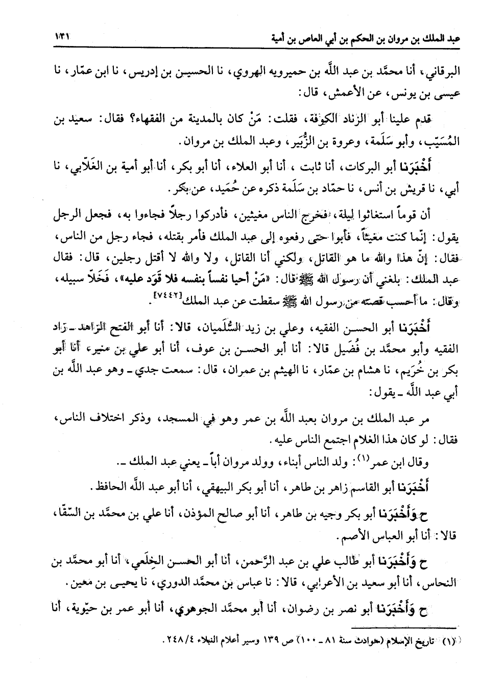 البرقاني أنا محمد بن عبد الله بن حميروية الهروي نا الحسين بن إدريس نا ابن عمار نا عيسى بن يونس عن الأعمش قال قدم علينا أبو الزناد الكوفة فقلت من كان بالمدينة من الفقهاء فقال سعيد بن المسيب وأبو سلمة وعروة بن الزبير وعبد الملك بن مروان أخبرنا أبو البركات أنا ثابت أنا أبو العلاء أنا أبو بكر أنا أبو أمية بن الغلابي نا أبي نا قريش بن أنس نا حماد بن سلمة ذكره عن حميد عن بكر أن قوما استغاثوا ليلة فخرج الناس مغيثين فادركوا رجلا فجاءوا به فجعل الرجل يقول إنما كنت مغيثا فأبوا حتى رفعوه إلى عبد الملك فأمر بقتله فجاء رجل من الناس فقال إن هذا والله ما هو القاتل ولكني أنا القاتل ولا والله لا أقتل رجلين قال فقال عبد الملك بلغني أن رسول الله (صلى الله عليه وسلم) قال من أحيا نفسا بنفسه فلا قود عليه