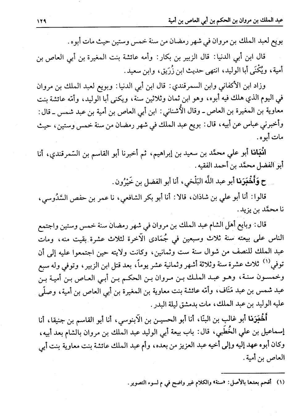 بويع لعبد الملك بن مروان في شهر رمضان من سنة خمس وستين حيث مات أبوه قال ابن ابي الدنيا قال الزبير بن بكار وامة عائشة بنت المغيرة بن ابي العاص بن أمية ويكنى أبا الوليد انتهى حديث ابن زريق وابن سعيد وزاد ابن الأكفاني وابن السمرقندي قال أبن أبي الدنيا وبويع العبد الملك بن مروان في اليوم الذي هلك فيه ابوه وهو ابن ثمان وثلاثين سنة ويكنى أبا الوليد وأمة عائشة بيت معاوية بن المغيرة بن المغيرة بن العاص وقال الأشناني ابن أبي العاص بن امية بن عبد شمس قال وأخبرني عباس عن ابيه قال بويع عبد الملك في شهر رمضان من سنة خمس وستين حيث مات أبوه أنبأنا أبو علي محمد بن سعيد بن إبراهيم ثم اخبرنا أبو القاسم بن السمرقندي أنا أبو الفضل محمد بن احمد الفقية ح وأخبرنا أبو عبد الله البلخي أنا أبو الفضل بن خيرون قالوا أنا أبو علي بن شاذان قالا أنا أبو بكر الشافعي نا عمر بن حفص السدوسي نا محمد بن يزيد قال وبايع اهل الشام عبد الملك بن مروان في شهر رمضان سنة خمس وستين واجتمع الناس على بيعته سنة ثلاث وسبعين في جمادى الآخرة لثلاث عشرة بقيت منه ومات عبد الملك للنصف من شوال سنة ست وثمانين وكانت ولايته حين احتمعوا عليه إلى أن توفي ثلاث عشرة سنة وثلاثة أشهر وثمانية عشر يوما بعد قتل ابن الزبير وتوفي وله سبع وخمسون سنة وهو عبد الملك بن مروان بن الحكم بن أبي العاص بن أمية بن عبد شمس بن عبد مناف وأمة عائشة بنت معاوية بن المغيرة بن أبي العاص بن أمية وصلى عليه الوليد بن عبد الملك مات بدمشق ليلة البدر أخبرنا أبو غالب بن البنا أنا أبو الحسين بن الآبنوسي أنا أبو القاسم بن جنيقا أنا إسماعيل بن علي الخطبي قال باب بيعة أبي الوليد عبد الملك بن مروان بالشام بعد أبيه وكان أبوه عهد إليه وإلى أخيه عبد العزيز من بعده وأم عبد الملك عائشة بنت معاوية بنت أبي العاص بن امية