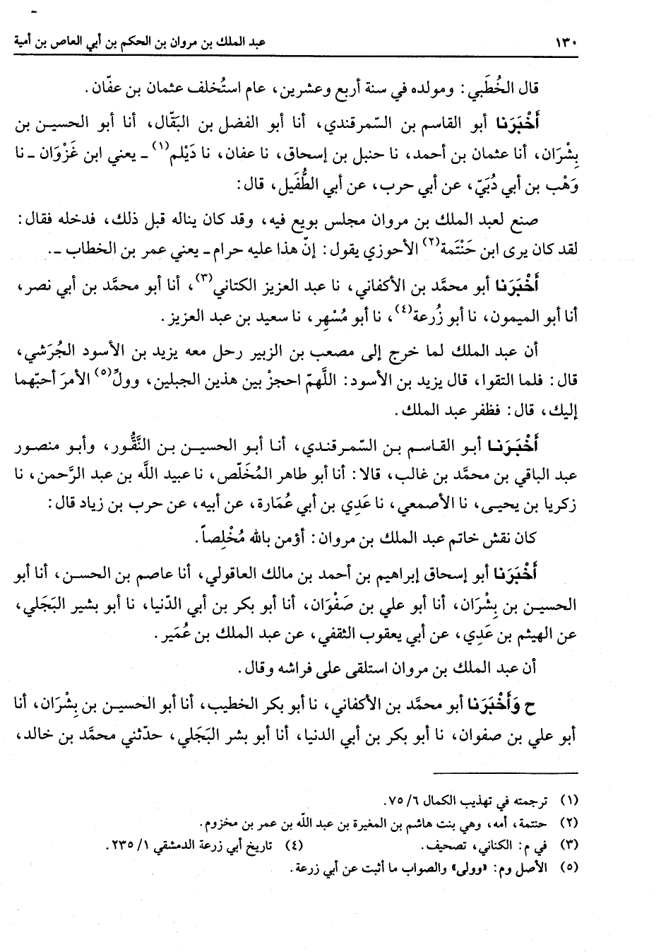 قال الخطبي ومولده في سنة أربع وعشرين عام استخلف عثمان بن عفان أخبرنا أبو القاسم بن السمرقندي أنا أبو الفضل بن البقال أنا أبو الحسين بن بشران أنا عثمان بن أحمد نا حنبل بن إسحاق نا عفان نا ديلم (1) يعني ابن غزوان نا وهب بن أبي دبي عن أبي حرب عن أبي الطفيل قال صنع لعبد الملك بن مروان مجلس بويع فيه وقد كان يناله قبل ذلك فدخله فقال لقد كان يرى ابن حنتمة (2) الأحوزي يقول إن هذا عليه حرام يعني عمر بن الخطاب أخبرنا أبو محمد بن الأكفاني نا عبد العزيز الكتاني (3) أنا أبو محمد بن أبي نصر أنا أبو الميمون نا أبو زرعة (4) نا أبو مسهر نا سعيد بن عبد العزيز أن عبد الملك لما خرج إلى مصعب بن الزبير رحل معه يزيد بن الأسود الجرشي قال فلما التقوا قال يزيد بن الأسود اللهم احجز بين هذين الجبلين وول (5) الأمر أحبهما إليك قال فظفر عبد الملك اخبرنا أبو القاسم بن السمرقندي أنا أبو الحسين بن النقور وأبو منصور عبد الباقي بن محمد بن غالب قالا أنا أبو طاهر المخلص نا عبيد الله بن عبد الرحمن نا زكريا بن يحيى نا الأصمعي نا عدي بن أبي عمارة عن أبيه عن حرب بن زياد قال كان نقش خاتم عبد الملك بن مروان أؤمن بالله مخلصا أخبرنا أبو إسحاق إبراهيم بن أحمد بن مالك العاقولي أنا عاصم بن الحسن أنا أبو الحسين بن بشران أنا أبو علي بن صفوان أنا أبو بكر بن أبي الدنيا نا أبو بشير البجلي عن الهيثم بن عدي عن ابي يعقوب الثقفي عن عبد الملك بن عمير أن عبد الملك بن مروان استلقى على فراشه وقال ح وأخبرنا أبو محمد بن الأكفاني نا أبو بكر الخطيب أنا أبو الحسين بن بشران أنا أبو علي بن صفوان نا أبو بكر بن أبي الدنيا أنا أبو بشر البجلي حدثني محمد بن خالد
