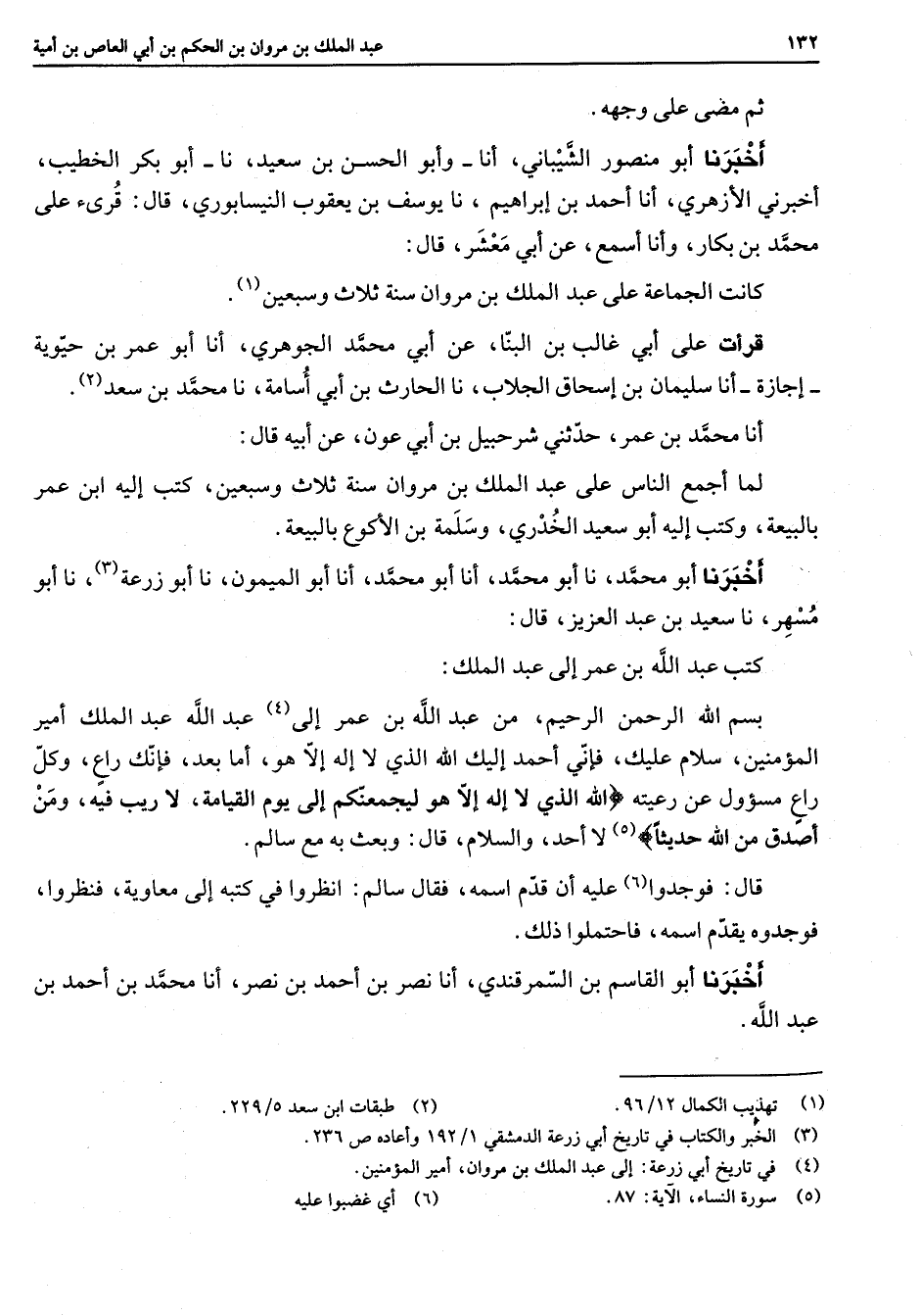 ثم مضى على وجهه أخبرنا أبو منصور الشيباني أنا وأبو الحسن بن سعيد نا أبو بكر الخطيب أخبرني الأزهري أنا أحمد بن إبراهيم نا يوسف بن يعقوب النيسابوري قال قرئ على محمد بن بكار وأنا اسمع عن أبي معشر قال كانت الجماعة على عبد الملك بن مروان سنة ثلاث وسبعين (1) قرأت على أبي غالب بن البنا عن أبي محمد الجوهري أنا أبو عمر بن حيوية إجازة أنا سليمان بن إسحاق الجلاب نا الحارث بن أبي أسامة نا محمد بن سعد (2) أنا محمد بن عمر حدثني شرحبيل بن أبي عون عن أبيه قال لما أجمع الناس على عبد الملك بن مروان سنة ثلاث وسبعين كتب إليه ابن عمر بالبيعة وكتب إليه أبو سعيد الخدري وسلمة بن الأكوع بالبيعة أخبرنا أبو محمد نا أبو محمد أنا أبو محمد أنا أبو الميمون نا أبو زرعة (3) نا أبو سهر نا سيعد بن عبد العزيز قال كتب عبد الله بن عمر إلى عبد الملك بسم الله الرحمن الرحيم من عبد الله بن عمر إلى (4) عبد الله عبد الملك أمير المؤمنين سلام عليك فإني أحمد إليك الله الذي لا إله إلا هو أما بعد فإنك راع وكل راع مسؤول عن رعيته " الله الذي لا إله إلا هو ليجمعنكم إلى يوم القيامة لا ريب فيه ومن اصدق من الله حديثا " (5) لا أحد والسلام قال وبعث به مع سالم قال فوجدوا (6) عليه أن قدم اسمه فقال سالم انظروا في كتبه إلى معاوية فنظروا فوجدوه يقدم اسمه فاحتملوا ذلك اخبرنا أبو القاسم بن السمرقندي أنا نصر بن أحمد بن نصر أنا محمد بن أحمد بن عبد الله
