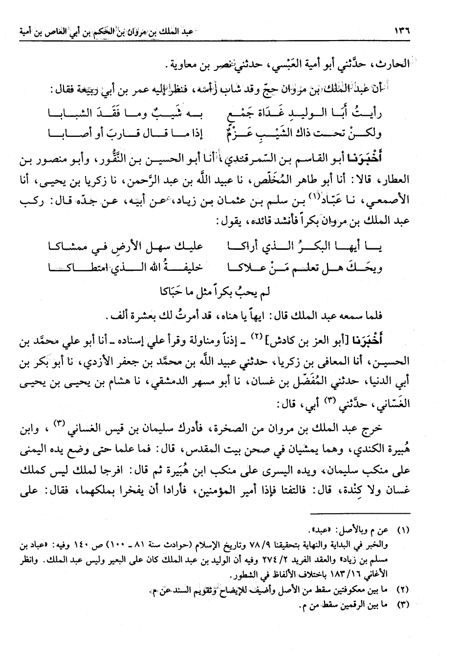 الحارث حدثني أبو أمية العبسي حدثني نصر بن معاوية أن عبد الملك بن مروان حج وقد شاب رأسه فنظر إليه عمر بن ابي ربيعة فقال * رأيت أبا الوليد غداة جمع * به شيب وما فقد الشبابا ولكن تحت ذاك الشيب عزم * إذا ما قال قارب أو أصابا * أخبرنا أبو القاسم بن السمرقندي أنا أبو الحسين بن النقور وابو منصور بن العطار قالا أنا أبو طاهر المخلص نا عبيد الله بن عبد الرحمن نا زكريا بن يحيى أنا الأصمعي نا عباد (1) بن سلم بن عثمان بن زياد عن ابيه عن جده قال ركب عبد الملك بن مروان بكرا فأنشد يقول * يا أيها البكر الذي أراكا * عليك سهل الأرض في ممشاكا ويحك هل تعلم من علاكا * خليفة الله الذي امتطاكا لم يحب بكرا مثل ما حباكا فلما سمعه عبد الملك قال أيها يا هناه قد أمرت لك بعشرة ألف أخبرنا أبو العز بن كادش (2) إذنا ومناولة وقرأ علي إسناده أنا أبو علي محمد بن الحسين أنا المعافي بن زكريا حدثني عبيد الله بن محمد بن جعفر الأزدي نا أبو بكر بن أبي الدنيا حدثني المفضل بن غسان نا أبو مسهر الدمشقي نا هشام بن يحيى بن يحيى الغساني حدثني (3) ابي قال خرج عبد الملك بن مروان من الصخرة فادرك سليمان بن قيس الغساني (3) وابن هبيرة الكندي وهما عشيان في صحن بيت المقدس قال فما علما حتى وضع يده اليمنى على منكب سليمان ويده اليسرى على منكب أبن هبيرة ثم قال افرجا لملك ليس كملك غسان ولا كندة فالتفتا فإذا أمير المؤمنين فأرادا يفخرا بملكهما فقال على