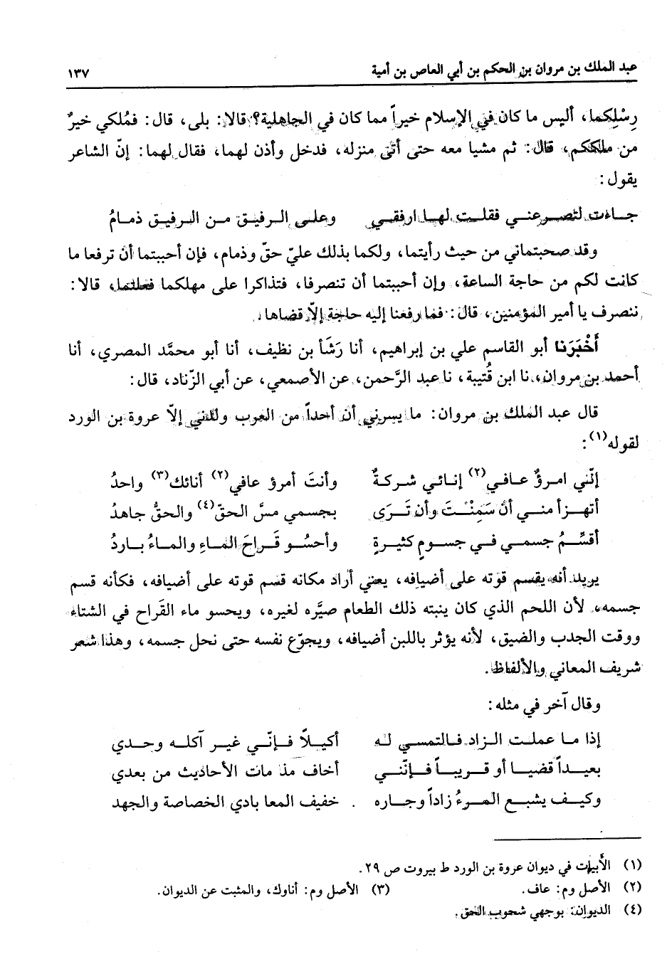 رسلكما اليس ما كان في الإسلام خيرا مما كان في الجاهلية قالا بلى قال فملكي خير من ملككم قال ثم مشيا معه حتى أتى منزله فدخل وأذن لهما فقال لهما إن الشاعر يقول * جاءت لتصرعني فقلت لها ارفقي * وعلى الرفيق من الرفيق ذمام * وقد صحبتماني من حيث رأيتما ولكما بذلك علي حق وذمام فإن أحببتما أن ترفعا ما كانت لكم من حاجة الساعة وإن أحببتما أن تنصرفا فتذاكرا على مهلكما فعلتما قالا ننصرف يا أمير المؤمنين قال فما رفعنا إليه حاجة إلا قضاها أخبرنا أبو القاسم علي بن إبراهيم أنا رشا بن نظيف أنا أبو محمد المصري أنا أحمد بن مروان نا ابن قتيبة نا عبد الرحمن عن الأصمعي عن أبي الزناد قال قال عبد الملك بن مروان ما يسرني أن احدا من العرب ولدني إلا عروة بن الورد لقوله (1) * إني امرؤ عافي (2) شركة * وأنت أمرؤ عافي (2) أنائك (3) واحد أتهزأ مني أن سمنت وأن ترى * بجسمي مس الحق والحق جاهد أقسم جسمي في جسوم كثيرة * وأحسوا قراح الماء والماء بارد * يريد أنه يقسم قوته على أضيافة يعني أراد مكانه قسم قوته على أضيافة فكأنة قسم جسمه لأن اللحم الذي كان ينبته ذلك الطعام صيرة لغيرة ويحسو ماء القراح في الشتاء ورقت الجدب والضيق لأنه يؤثر باللبن أضيافة ويجوع نفسه حتى نحل جسمه وهذا شعر شريف المعاني والألفاظ وقال آخر في مثله * إذا ما عملت الزاد فالتمسي له * أكيلا فإني غير أكله وحدي بعيدا قضيا أو قريبا فإنني * أخاف مذ مات الأحاديث من بعدي وكيف يشبع المرء زادا وجاره * خفيف المعا بادي الخصاصة والجهد *