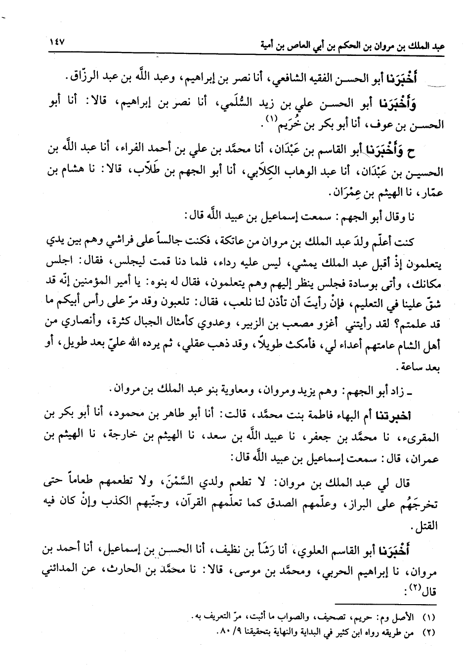 أخبرنا أبو الحسن الفقية الشافعي أنا نصر بن إبراهيم وعبد الله بن عبد الرزاق وأخبرنا أبو الحسن علي بن زيد السلمي أنا نصر بن إبراهيم قالا أنا أبو الحسن بن عوف أنا أبو بكر بن خريم (1) ح وأخبرنا أبو القاسم بن عبدان أنا محمد بن علي بن أحمد الفراء أنا عبد الله بن الحسين بن عبدان أنا عبد الوهاب الكلابي أنا أبو الجهم بن طلاب قالا نا هشام بن عمار نا الهيثم بن عمران نا وقال أبو الجهم سمعت إسماعيل بن عبيد الله قال كنت أعلم ولد عبد الملك بن مروان عن عاتكة فكنت جالسا على فراشي وهم بين يدي يتعلمون إذ أقبل عبد الملك يمشي ليس عليه رداء فلما دنا قمت ليجلس فقال اجلس مكانك وأتى بوسادة فجلس ينظر إليهم وهم يتعلمون فقال له بنوه يا أميرا المؤمنين إنه قد شق علينا في التعليم فإن رأيت أن تأذن لنا نلعب فقال تلعبون وقد مر على رأس أبيكم ما قد علمتم لقد رأيتني أغزو مصعب بن الزبير وعدوي كأمثال الجبال كثرة وأنصاري من أهل الشام عامتهم أعداء لي فأمكث طويلا وقد ذهب عقلي ثم يرده الله علي بعد طويل أو بعد ساعة زاد أبو الجهم وهم يزيد ومروان ومعاوية بنو عبد الملك بن مروان أخبرتنا أم البهاء فاطمة بنت محمد قالت أنا أبو طاهر بن محمود أنا أبو بكر بن المقرئ نا محمد بن جعفر نا عبيد الله بن سعد نا الهيثم بن خارجة نا الهيثم بن عمران قال سمعت إسماعيل بن عبيد الله قال قال لي عبد الملك بن مروان لا تطعم ولدي السمن ولا تطعمهم طعاما حتى تخرجهم على البراز وعلمهم الصدق كما تعلمهم القرآن وجنيهم الكذب وإن كان فيه القتل أخبرنا أبو القاسم العلوي أنا رشا بن نظيف أنا الحسن بن إسماعيل أنا أحمد بن مروان نا إبراهيم الحربي ومحمد بن موسى قالا نا محمد بن الحارث عن المدائني قال (2)