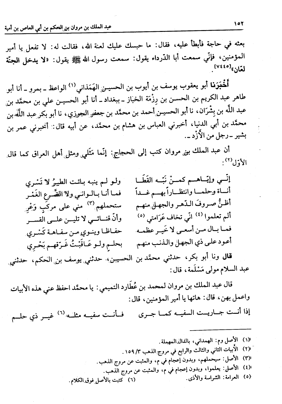 [7445] أخبرنا أبو يعقوب يوسف بن أيوب بن الحسين الهمذاني (1) الواعظ بمرو أنا أبو طاهر الكريم بن السحن بن رزمة الخباز ببغداد أنا أبو الحسين علي بن محمد بن عبد الله بن بشران نا أبو الحسين أحمد الحسين أحمد بن محمد بن جعفر الجوزي نا أبو بكر عبد الله بن محمد بن أبي الدنيا أخبرني العباس بن هشام بن محمد عن ابيه قال أخبرني عمر بن بشير رجل من الأزد أن عبد الملك بن مروان كتب إلى الحجاج إنما مثلي ومثل أهل العراق كما قال الأول (2) * إني وإياهم كمن نبه القطا * ولو لم ينبه باتت الطير لا تسري أناة وحلما وانتظار بهم غدا * فما أنا بالواني ولا الضرع الغمر أظن صروف الدهر والجهل منهم * ستحملهم (3) مني على مركب وعر ألم تعلموا (4) إني تخاف عرامتي (5) * وأن قناتي لا تلين على القسر فما بال من اسعى لا خير عظمة * حفاظا وينوي من سفاهة كسرى أعود على ذي الجهل والذنب منهم * بحلم ولو عاقبت غرقهم بحري * قال ونا أبو بكر حدثني محمد بن الحسين حدثني يوسف بن الحكم حدثني عبد السلام مولى مسلمة قال قال عبد الملك بن مروان لمحمد بن عطار التميمي يا محمد احفظ عني هذه الأبيات واعمل بهن قال هاتها يا أمير المؤمنين قال * إذا أنت جاريت السفية كما جرى * فانت سفية مثله (6) غير ذي حلم