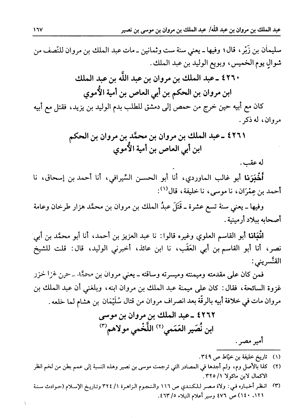4261 - عبد الملك بن مروان بن محمد بن مروان بن الحكم ابن ابي العاص بن أمية الأموي له عقب اخبرنا أبو غالب الموردي أنا أبو الحسن السيرافي أنا احمد بن إسحاق نا أحمد بن عمران نا موسى نا خليفة قال (1) وفيها يعني سنة تسع عشرة قتل عبد الملك بن مروان بن محمد هزار طرخان وعامة أصحابه ببلاد أرمينية أنبأنا أبو القاسم العلوي وغيره قالوا نا عبد العزيز بن أحمد أنا أبو محمد بن أبي نصر أنا أبو القاسم بن ابي العقب نا ابن عائذ اخبرني الوليد قال قلت للشيخ القنسريني فمن كان على مقدمته وميمنته وميسرته وساقته يعني مروان بن محمد حين غزا خزر غزوة السائحة فقال كان على ميمنة عبد الملك بن مروان ابنه وبلغني ان عبد الملك بن مروان مات في خلافة أبيه بالرقة بعد انصراف مروان من قتال سليمان بن هشام لما خلعه 4262 عبد الملك بن مروان بن موسى ابن نصير العممي اللخمي مولاهم (3) أمير مصر