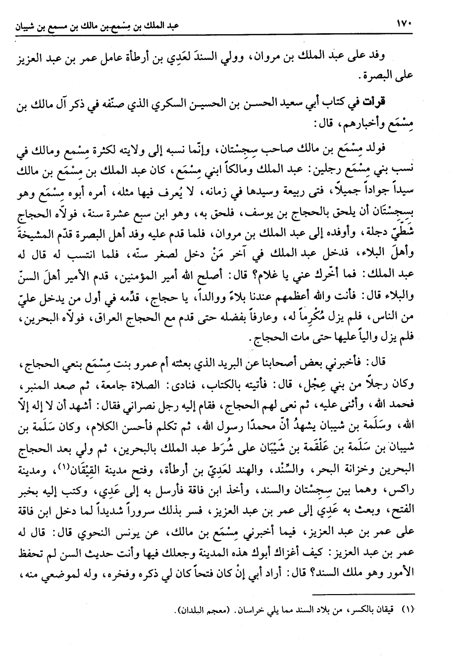 وفد على عبد الملك بن مروان وولي السند لعدي بن أرطأة عامل عمر بن عبد العزير على البصرة قرأت في كتاب ابي سعيد الحسن بن الحسين السكري الذي صنفه في ذكر آل مالك بن مسمع وأخبارهم قال فولد مسمع بن مالك صاحب سجستان وإنما نسبة إلى ولايته لكثرة مسمع ومالك في نسب بني مسمع رجلين عبد الملك ومالكا ابني مسمع كان عبد الملك بن مسمع بن مالك سيدا جوادا جميلا فتى ربيعة وسيدها في زمانه لا يعرف فيها مثله أمره أبوه مسمع وهو بسجستان ان يلحق الحجاج بن يوسف فلحق به وهو ابن سبع عشرة سنة فولاه الحجاج شطي دجلة وأوفده إلى عبد الملك بن مروان فلما قدم عليه وفد أهل البصرة قدم المشيخة وأهل البلاء فدخل عبد الملك في آخر من دخل لصغر سنة فلما انتسب له قال له عبد الملك فما أخرك عني يا غلام قال أصلح الله امير المؤمنين قدم الأمير أهل السن والبلاء قال فأنت والله أعظمهم عندنا بلاء ووالدا يا حجاج قدمه في أول من يدخل علي من الناس فلم يزل مكرما له عارفا بفضله حتى قدم مع الحجاج العراق فولاه البحرين فلم يزل واليا عليها حتى مات الحجاج قال فأخبرني بعض أصحابنا عن البريد الذي بعثته أم عمرو بنت مسمع بنعي الحجاج وكان رجلا من بني عجل قال فأتيته بالكتاب فنادى الصلاة جامعة ثم صعد المنبر فحمد الله واثنى عليه ثم لفى لهم الحجاج فقام إليه رجل نصراني فقال أشهد أن لا إله إلا الله وسلمه بن شيبان يشهد أن محمدا رسول الله ثم تكلم فاحسن الكلام وكان سلمة بن شيبان بن سلمة بن علقمة بن شيبان على شرط عبد الملك بالبحرين ثم ولي بعد الحجاج البحرين وخزانة البحر والسند والهند لعدي بن أرطأه وفتح مدينة القيقان (1) ومدينة راكس وهما بين سجستان والسند وأخذ ابن فاقة فأرسل به إلى عدي وكتب إليه بخبر الفتح وبعث به عدي إلى عمر بن عبد العزيز فسر بذلك سرورا شديدا لما دخل ابن فاقة على عمر بن عبد العزيز فميا أخبرني مسمع بن مالك عن يونس النحوي قال قال له عمر بن عبد العزيز كيف أغزا ك أبوك هذه المدينة وجعلك فيها وأنت حديث السن لم تحفظ الأمور وهو ملك السند قال أراد أبي إن كان فتحا كان لي ذكره وفخره وله لموضعي منه