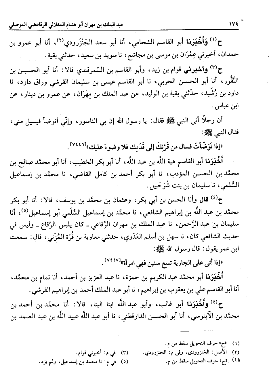 ح (1) وأخبرنا أبو القاسم الشحامي أنا أبو سعد الجنزرودي (2) أنا أبو عمرو بن حمدان أخبرني عمران بن موسى بن مجاشع نا سويد ين سعيد حدثني بقية ح (3) وأخبرني قوام بن زيد وابو القاسم بن السمرقندي قالا أنا أبو الحسين بن النقور أنا أبو الحسن الحربي نا أبو القاسم عيسى بن سليمان القرشي وراق داود نا داود بن رشيد حدثني بقية بن الوليد عن عبد الملك بن مهران عن عمرو بن دينار عن ابن عباس أن رجلا أتى النبي (صلى الله عليه وسلم) فقال يا رسول الله إن بي الناسور وإني أتوضأ فيسيل مني فقال النبي (صلى الله عليه وسلم) إذا توضأت فسال من قرنك إلى قدمك فلا وضوء عليك