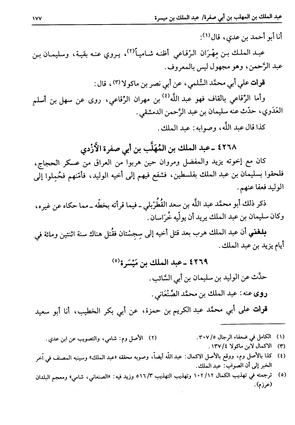 4269 - عبد الملك بن ميسرة (5) حدث عن الوليد بن سليمان بن أبي السائب روى عنه عبد الملك بن محمد الصنعاني قرات علي أبي محمد بن عبد الكريم بن حمزة عن أبي بكر الخطيب أنا أبو سعيد