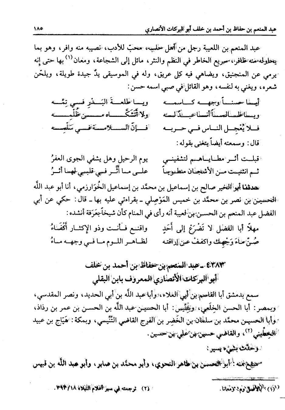 عبد المنعم بن اللعيبة رجل من أهل حلب محب للأدب نصيبه منه وافر وهو بما يحاوله منه ظافر سريع الخاطر في النظم والنثر مائل إلى الشجاعة ومعان (1) بها حتى أنه يرمي عن المنجنيق ويضاهي فيه كل عريق وله في الموسيقى يد جيدة طويلة ويلحن شعره ويغني به لنفسه وهو القائل في صبي اسمه حسن * أيا حسنا وجهه كاسمه * ويا طلعة البدر في تمه ويا ظالما أنا عبد له * ولا أتشكاه من ظلمة فلا يعجل الناس في حربه * فإن السلامة في سلمة * قال وسمعته أيضا يتغنى بقوله * قبلت أثر مطاياهم لتشفيني * يوم الرحيل يشفي الجوى العفر ثم انثنيت من الأشجان منطويا * على ما أثر في قلبي لها أثر * قال وسمعته أياض يتغنى بقوله * قبلت اثر مطاياهم لتشفيني * يوم الرحيل وهل يشفي الجوى العفر ثم انثنيت من الأشجان منطويا * على ما أثر في قلبي لها أثر * حدثنا أبو الخير صالح بن إسماعيل بن محمد بن إسماعيل الخوارزمي أنا أبو عبد الله الحسين بن نصر بن محمد بن خميس الموصلي بقراءتي عليه بها قال حكى عن أبي الفضل عبد المنعم بن الحسن بن لعيبة انه راى في المنام كأن شيخا بعرفه أنشده * مهلا أبا الفضل لاتضرع إلى أحد * واقنع فانت وذو الإكثار أكفاء صن ماء وجهك واكفف عن إراقته * لظاهر اللوم ما في وجهه ماء *