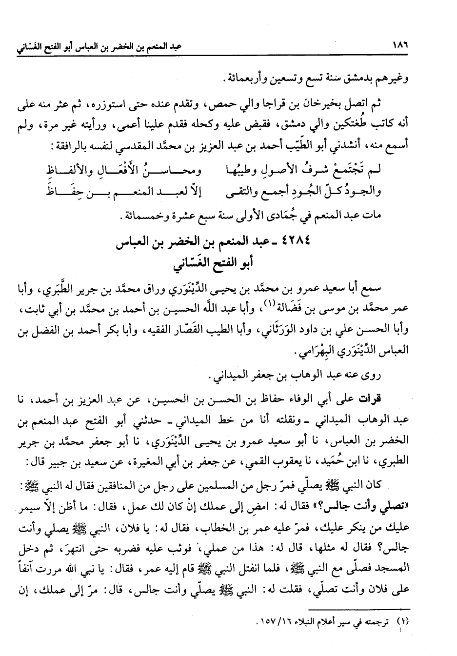 4284 - عبد المنعم بن الخضر بن العباس أبو الفتح الغساني سمع أبا سعيد عمرو بن محمد بن يحيى الدينوري وراق محمد بن جرير الطبري وأبا عمر محمد بن موسى بن فضالة (1) وأبا عبد الله الحسين بن أحمد بن محمد بن أبي ثابت وابا الحسن علي بن دواد الورثاني وأبا الطيب القصار الفقية وابا بكر أحمد بن الفضل بن العباس الدينوري البهرامي روى عنه عبد الوهاب بن جعفر الميداني قرأت علي أبي الوفاء حفاظ بن الحسن بن الحسين عن عبد العزيز بن احمد نا عبد الوهاب الميداني ونقلته أنا من خط الميداني حدثني أبو الفتح عبد المنعم بن الخضر بن العباس نا أبو سعيد عمرو بن يحيى الدينوري نا أبو جعفر محمد بن جرير الطبري نا أبن حميد نا يعقوب القمي عن جعفر بن أبي المغيرة عن سعيد بن جبير قال كان النبي (صلى الله عليه وسلم) يصلي فمر رجل من المسلمين على رجل من المنافقين فقال له النبي (صلى الله عليه وسلم) تصلي وانت جالس فقال له امض إلى عملك إن كان لك عمل فقال ما أظن إلا سيمر عليك من ينكر عليك فمر عليه عمر بن الخطاب فقال له يا فلان النبي (صلى الله عليه وسلم) يصلي وأنت جالس فقال له مثلها قال له هذا من عملي فوثب عليه فضربه حتى انتهر ثم دخل المسجد فصلى مع النبي (صلى الله عليه وسلم) فما انفتل النبي (صلى الله عليه وسلم) قام إليه عمر فقال يا نبي الله مررت آنفا على فلان وأنت تصلي فقلت له النبي (صلى الله عليه وسلم) يصلي وأنت جالس قال مر إلى عملك إن