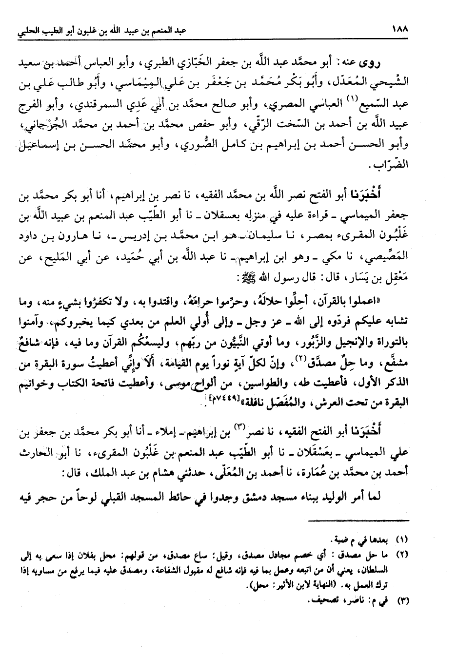 روى أبو محمد عبد الله بن جعفر الخبازي الطبري وأبو العباس أحمد بن سعيد الشيحي المعول وأبو بكر محمد بن جعفر بن علي الميماسي وأبو طالب علي بن عبد السميع (1) العباسي المصري وابو صالح محمد بن أبي عدي السمرقندي وأبو الفرج عبيد الله بن احمد بن السخت الرقي وابو حفص محمد بن أحمد بن محمد الجرجاني وأبو الحسن أحمد بن إبراهيم بن كامل الصوري وابو محمد الحسن بن إسماعيل الضراب أخبرنا أبو الفتح نصر الله بن محمد الفقية نا نصر بن إبراهيم أنا أبو بكر محمد بن جعفر الميماسي قراءة عليه في منزلة بعسقلان نا أبو الطيب عبد المنعم بن عبيد الله بن غلبون المقرئ بمصر نا سليمان هو ابن محمد بن إدريس نا هارون بن داود المصيصي نا مكي وهو ابن إبراهيم نا عبد الله بن أبي حميد عن أبي المليح عن معقل بن يسار قال قال رسول الله (صلى الله عليه وسلم) اعملوا بالقرآن أحلوا حلاله وحرموا حرامه واقتدوا به ولا تكفروا بشئ منه وما تشابه عليكم فردوه إلى الله عز وجل وإلى أولي العلم من بعدي كيما يخبروكم وآمنوا بالتوراة والإنجيل والزبور وما أوتي النبيون من ربهم وليسعكم القرآن وما فيه فإنه شافع مشفع وما حل مصدق (2) وإن لكل آية نورا يوم القيامة ألا وأني أعطيت سورة البقرة من الذكر الأول فأعطيت طه والطواسين من الواح موسى وأعطيت فاتحة الكتاب وخواتيم البقرة من تحت العرش والمفصل نافلة